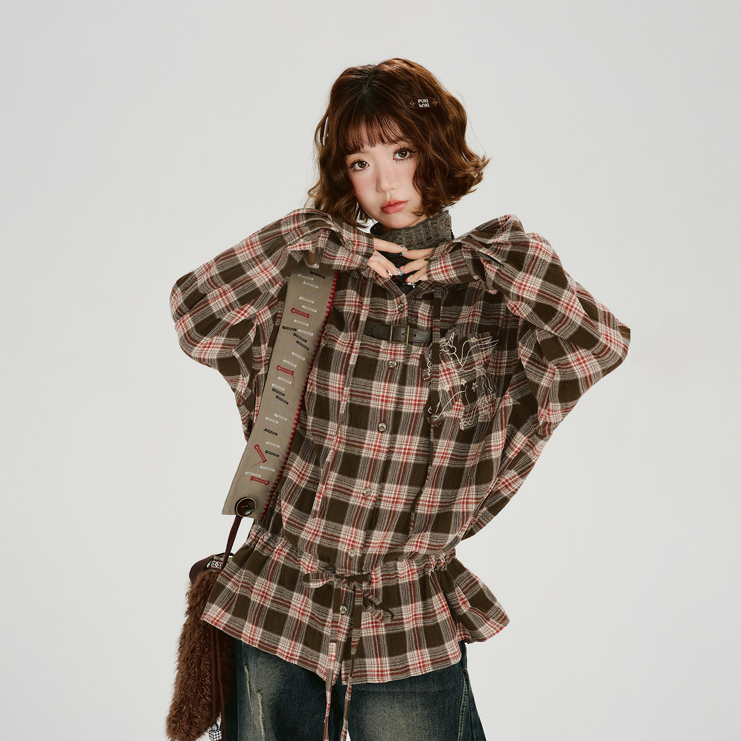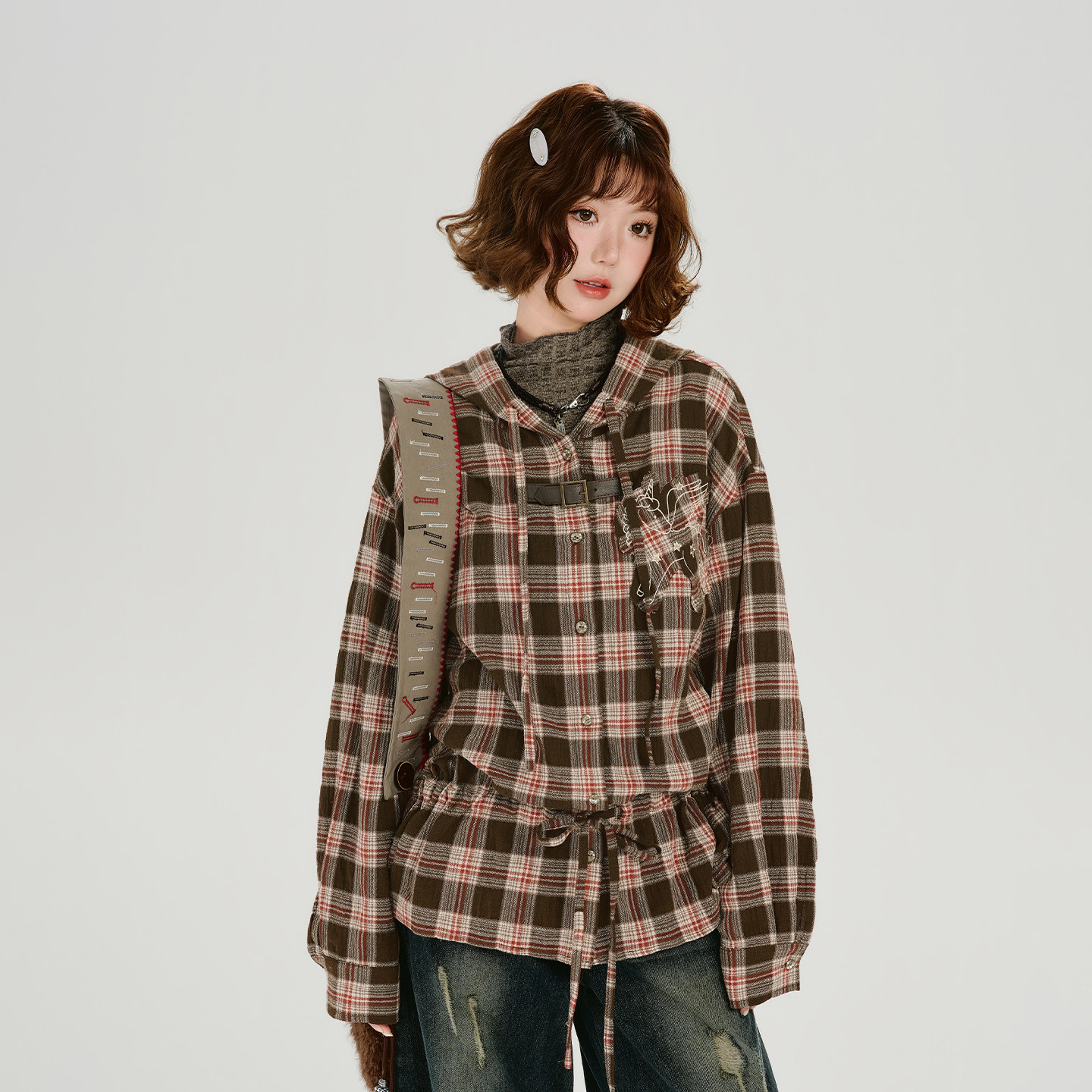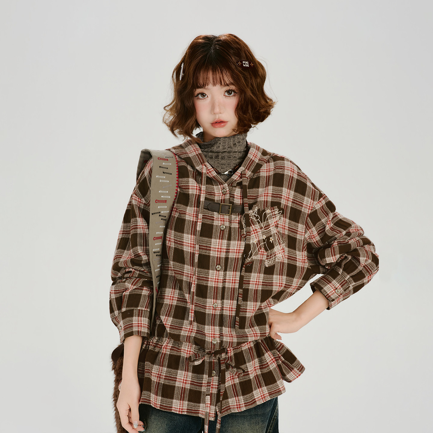 Girlyhalo美式 衬衫 女春新款 设计感宽松衬衣 复古刺绣连帽格纹长袖