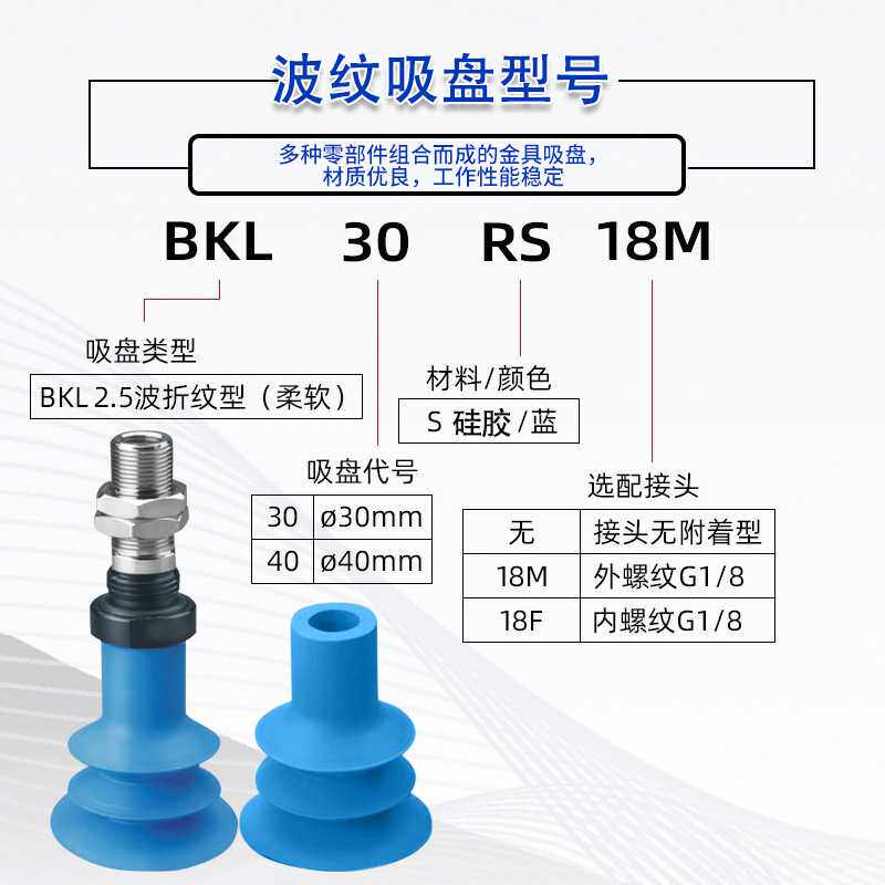 为您提供商品BKL30S蓝色褶皱波纹管真空吸盘BKL40S 18F瓦楞纸折盒机吸嘴 18M的详细介绍,