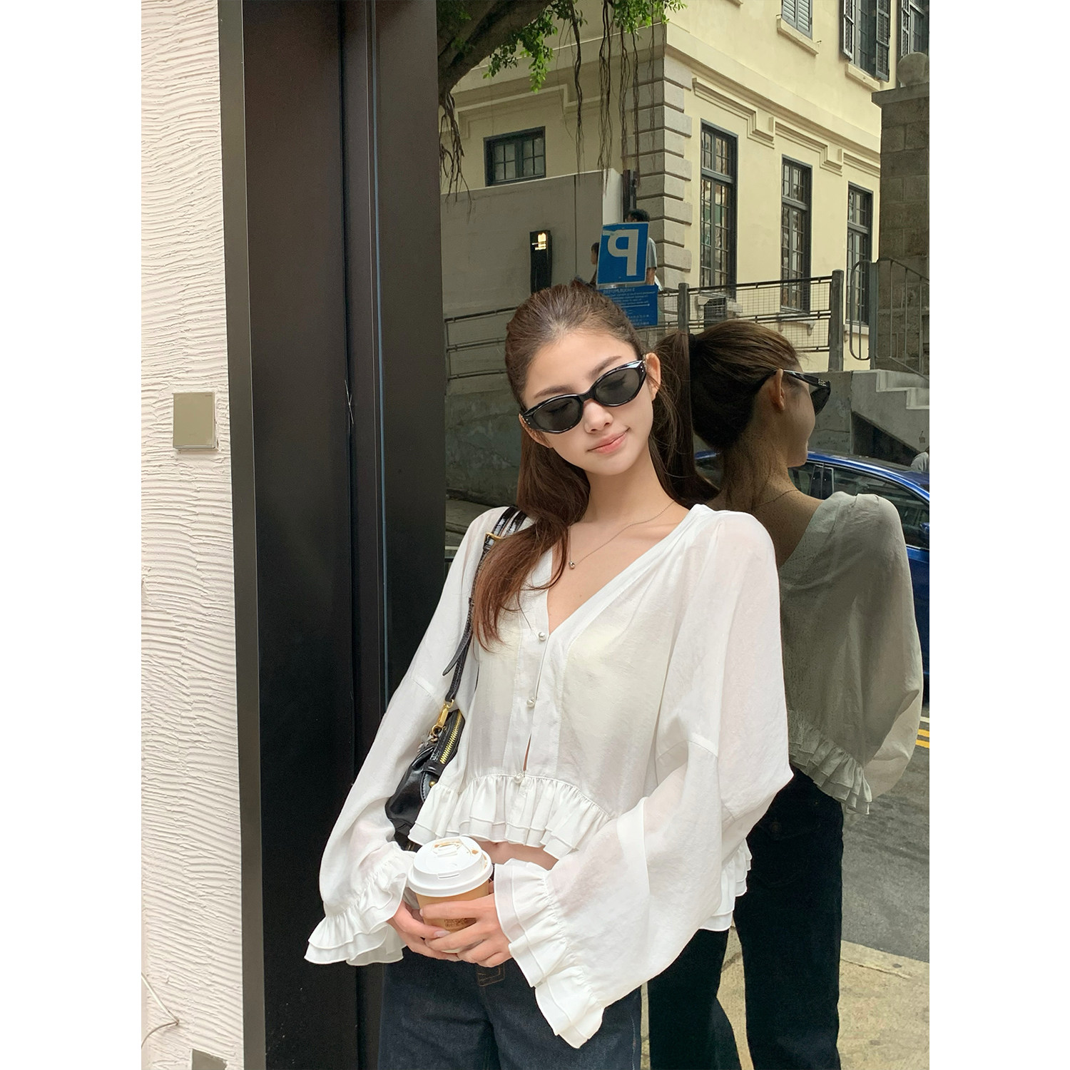 法式 nerd hot 荷叶边防晒短款 衬衫 立裁廓形V领喇叭袖 paosweet由