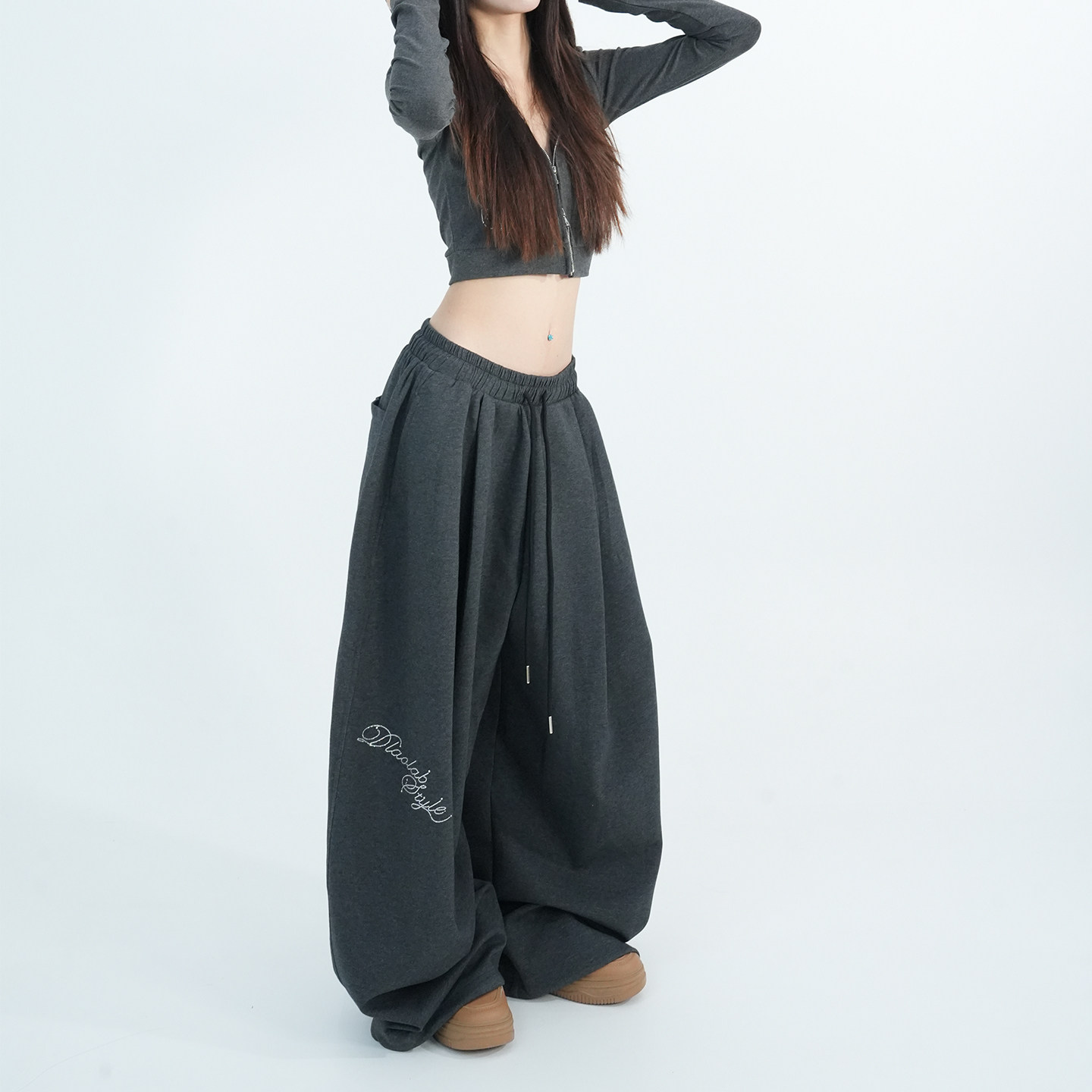 asomesome美式 女灰色修身 休闲松弛运动裤 子 黑色微喇直筒低腰卫裤