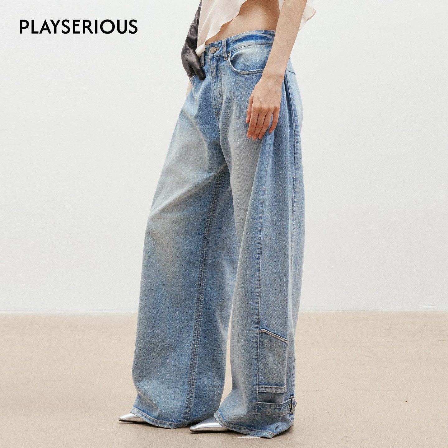 侧叠褶可调节阔腿牛仔裤 Medium Well 2026春夏新款 女休闲阔腿裤由