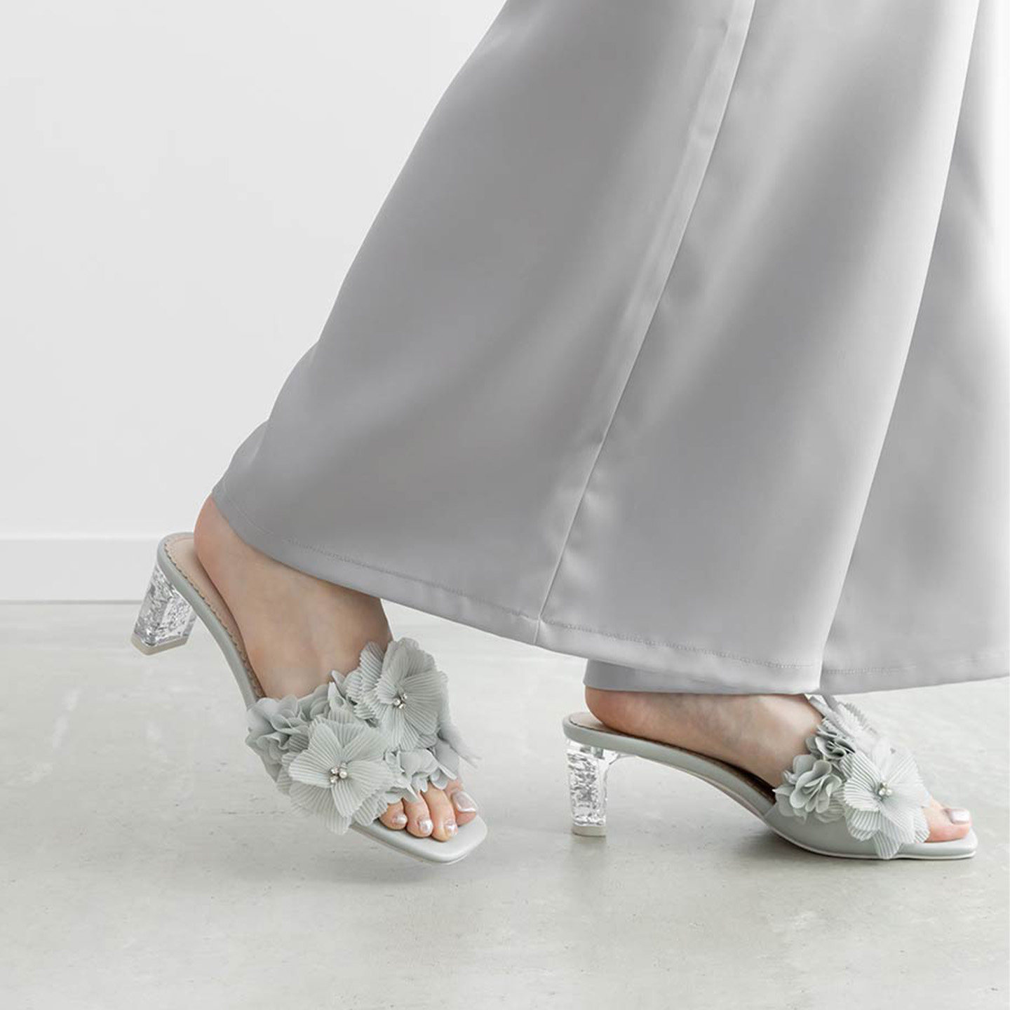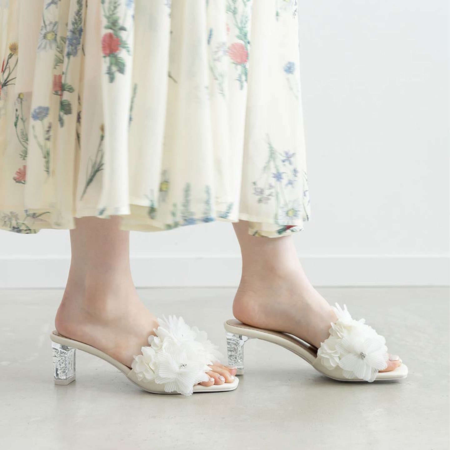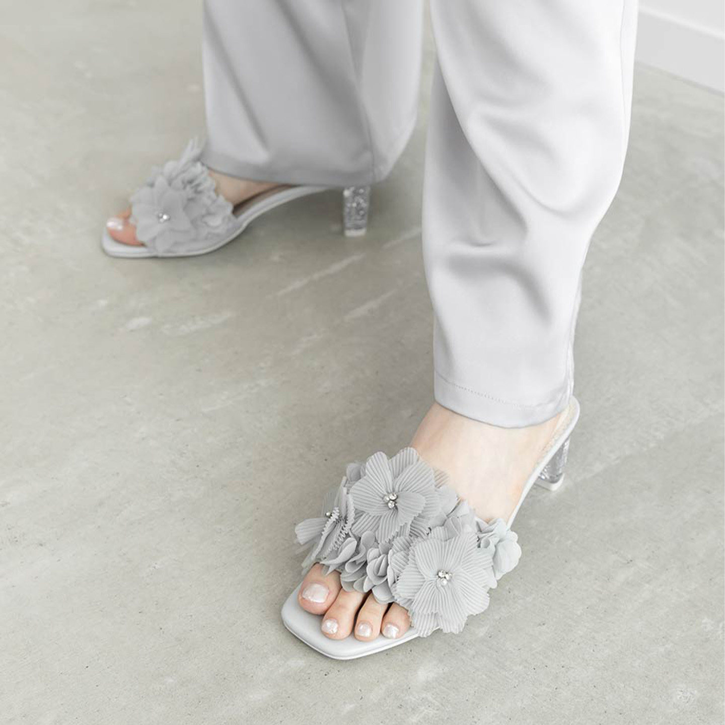 百褶花朵水钻方头粗高跟穆勒凉鞋 RANDA 26夏季 限定新款 PS37267 女