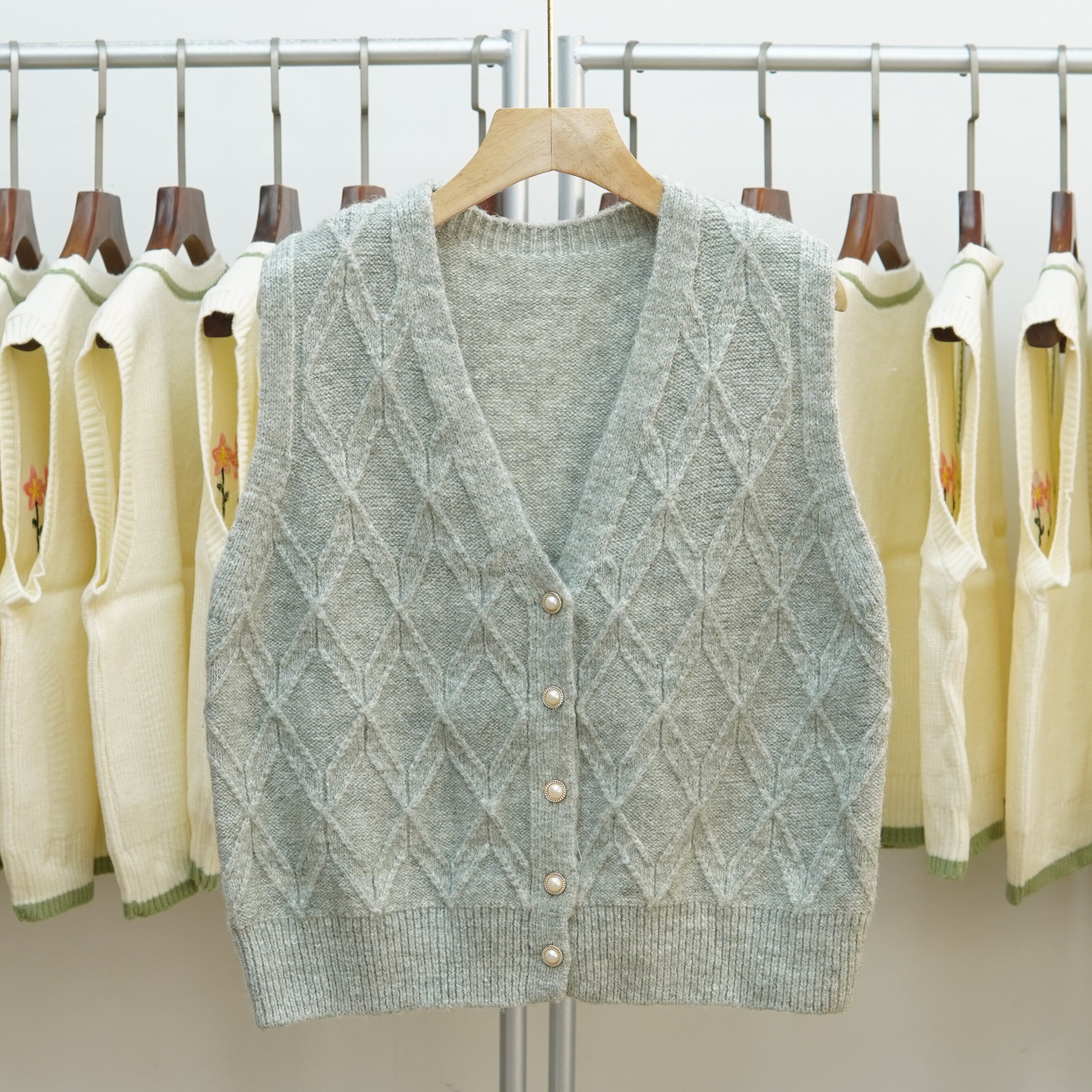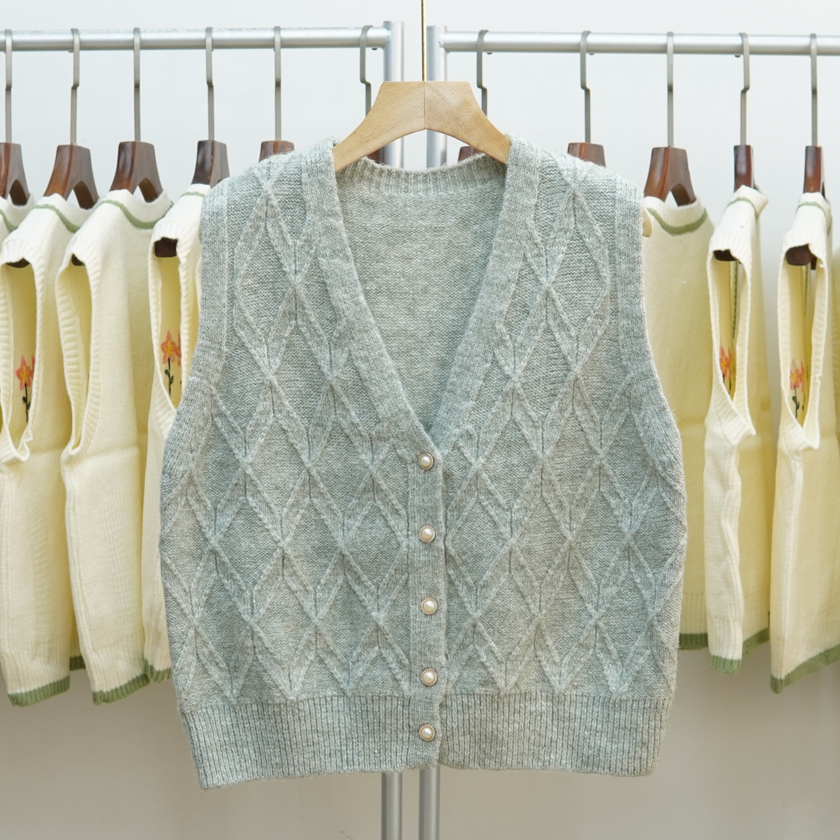697 V领麻花针织马甲女无袖 开衫 百搭菱形毛衣背心坎肩 复古韩版由