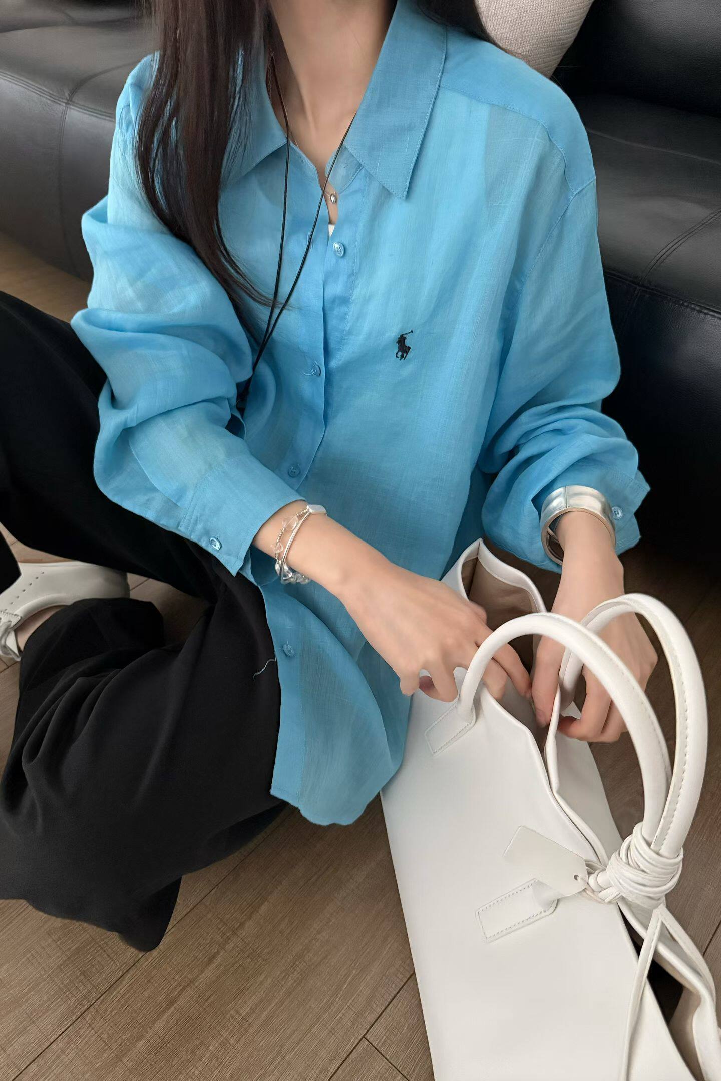 女长袖 宽松防晒上衣 设计感休闲风小马标刺绣苎麻衬衫 韩国1051时尚