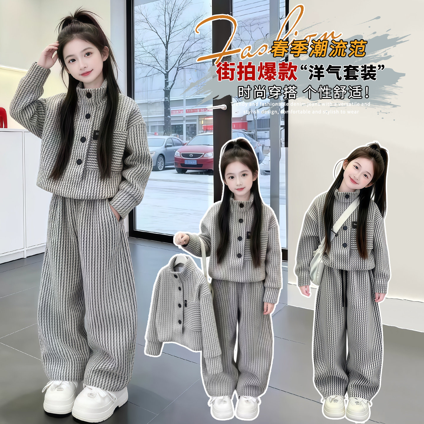女童春装 2026新款 洋气儿童春秋条纹卫衣阔腿裤 男童两件套 休闲套装