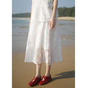 夏宽松休闲半裙 花吉Q580白色日系高腰光泽感花影半身裙2026新款由