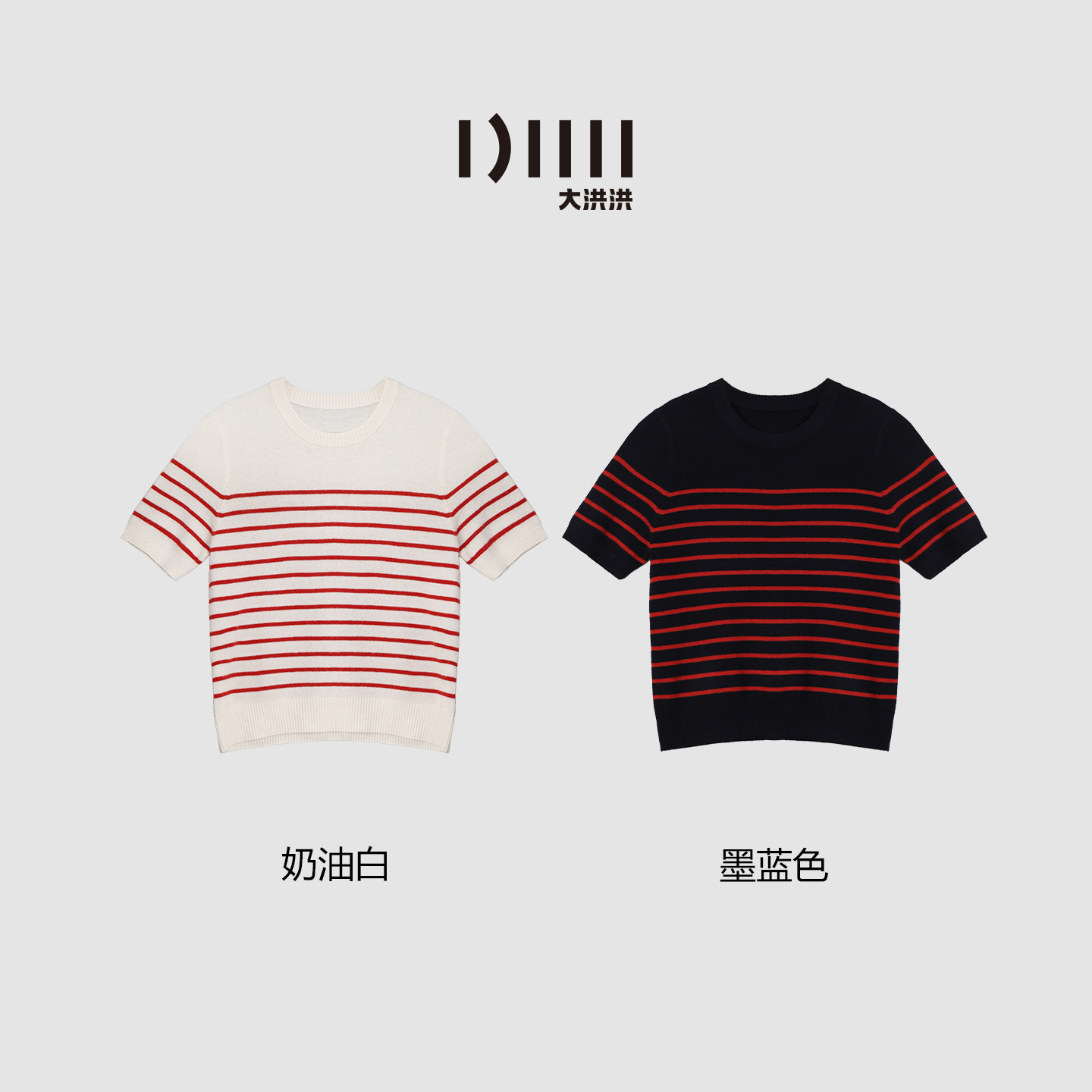 大洪洪 春新款 100%绵羊毛条纹短袖 圆领针织女气质上衣 樱桃子酱