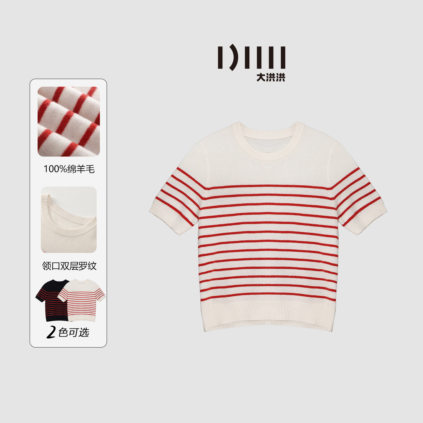大洪洪 春新款 100%绵羊毛条纹短袖 圆领针织女气质上衣 樱桃子酱由