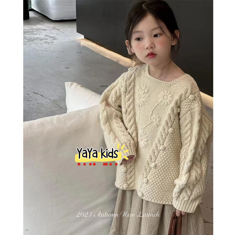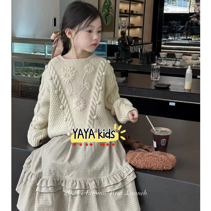 韩国女童手工钩花套头毛衣儿童秋冬季 两件套 格子半身裙长裙子套装由