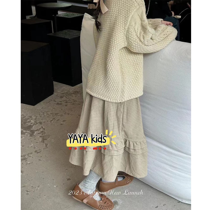 韩国女童手工钩花套头毛衣儿童秋冬季 两件套 格子半身裙长裙子套装