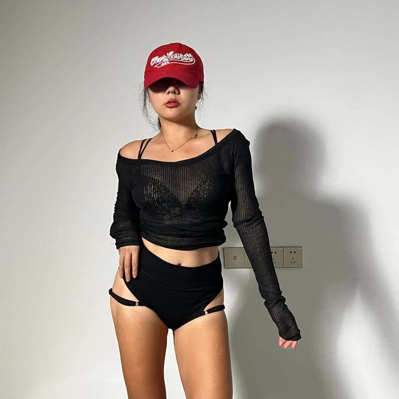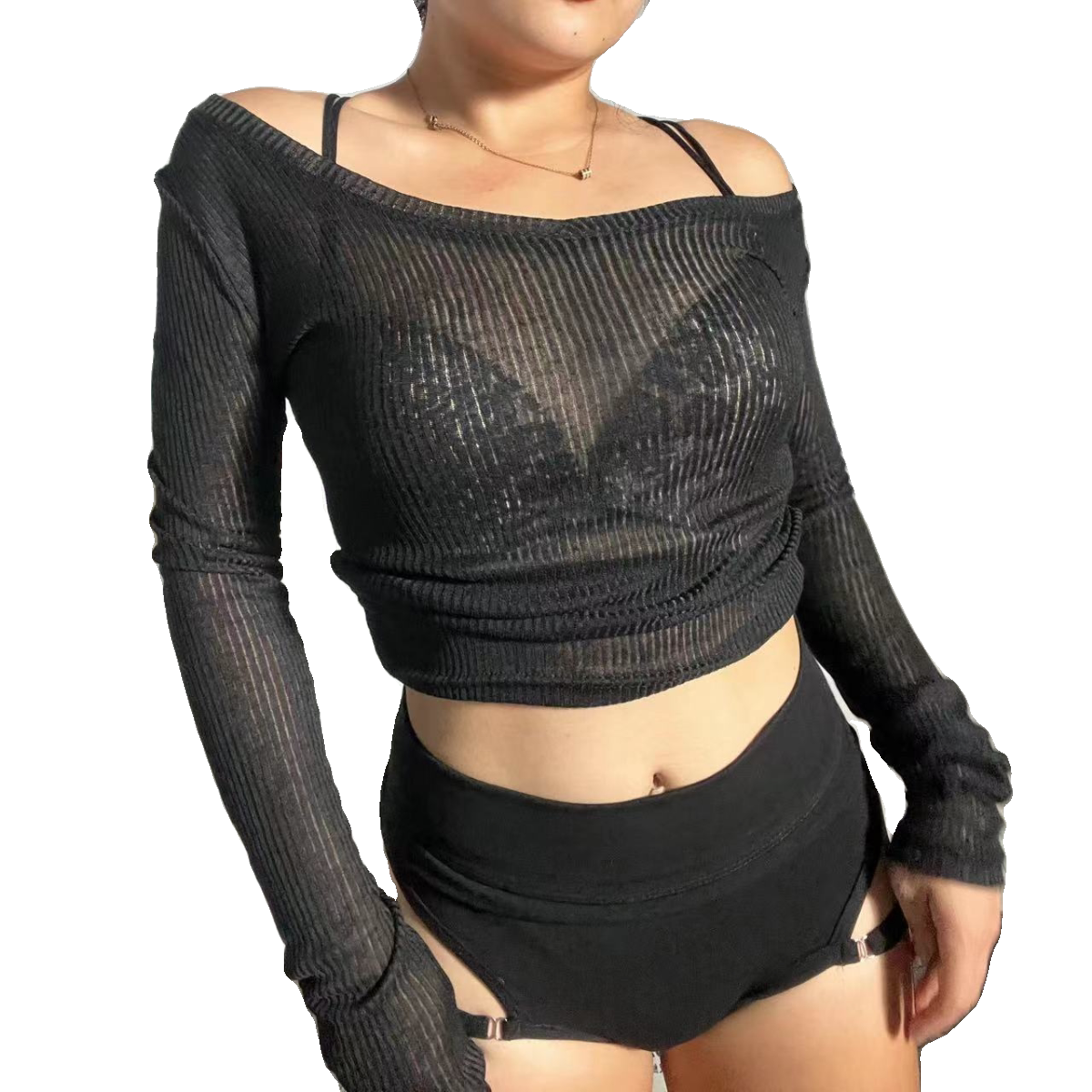 露锁骨透视显瘦针织薄款 heels百搭一字肩T 爵士舞V领上衣长袖 1996
