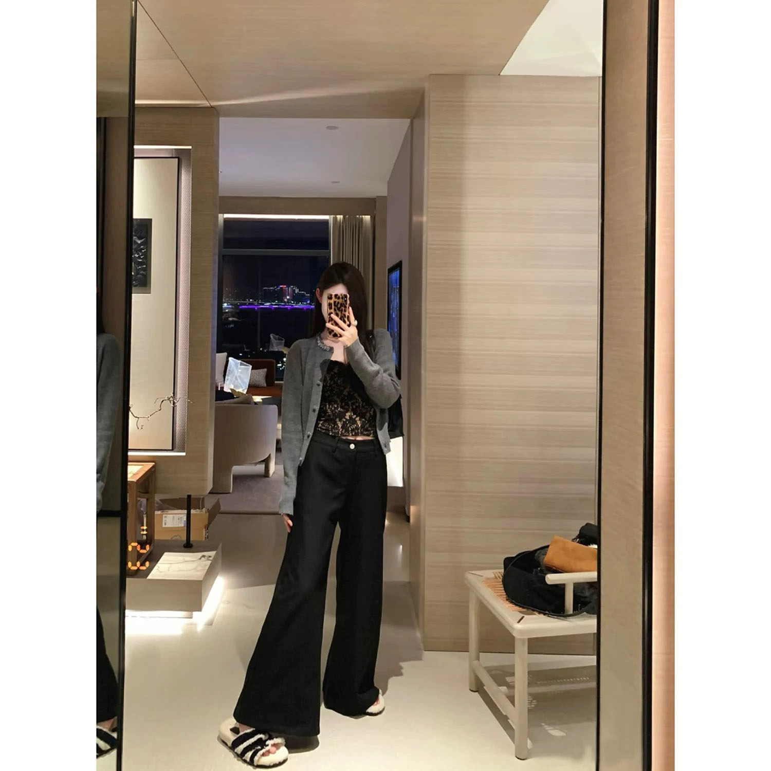 asomesome美式 女灰色修身 休闲松弛运动裤 子 黑色微喇直筒低腰卫裤