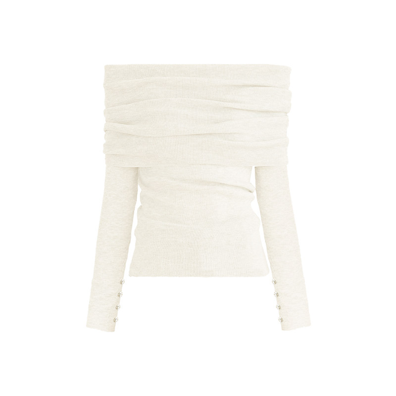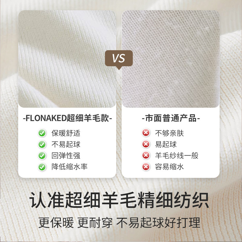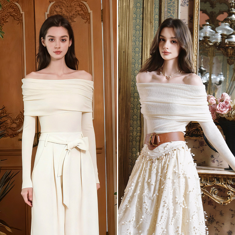 FLONAKED米白色羊毛混纺一字肩针织打底衫 女秋冬季 爆款