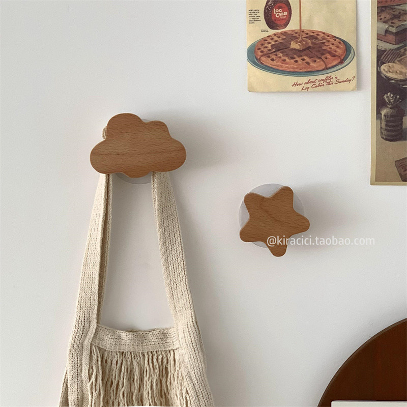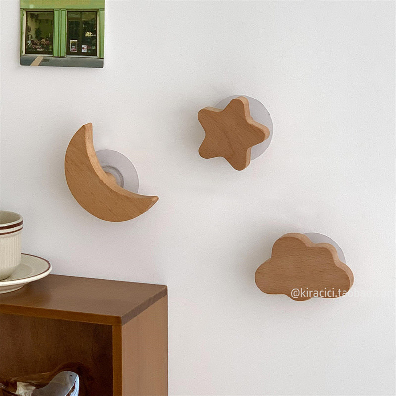 创意可爱实木挂钩星星月亮云朵免打孔木质粘钩免钉无痕宿舍挂衣钩