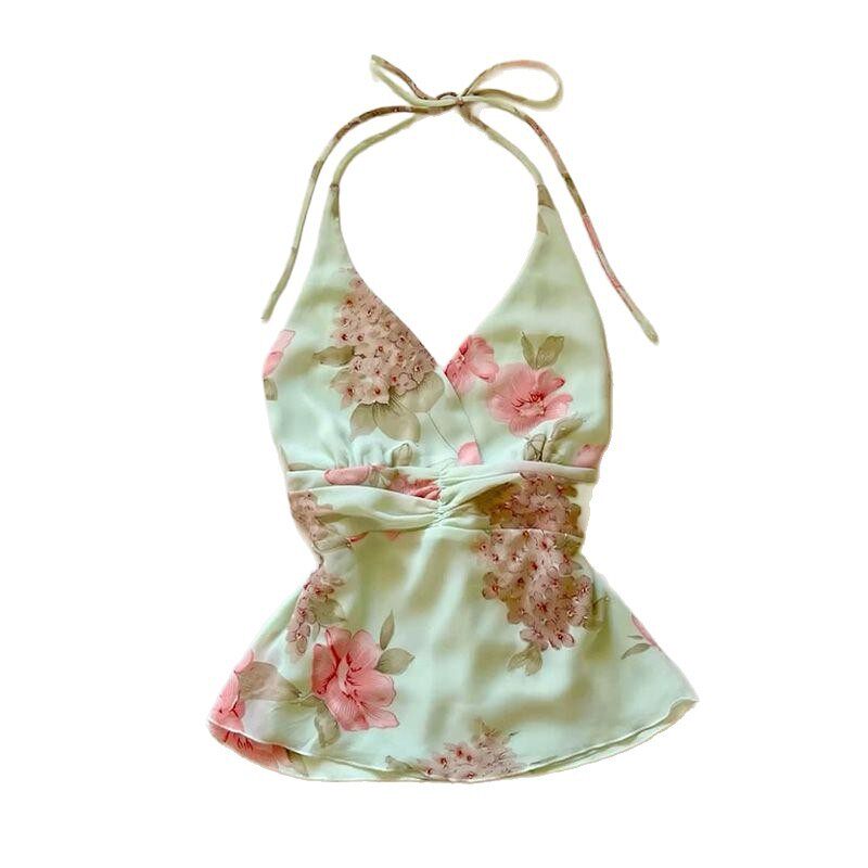 Tank 新款 花朵印花V领法式 复古绑带挂脖吊带上衣女 tops2025年夏季