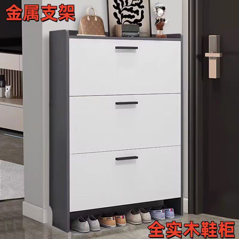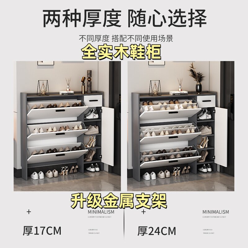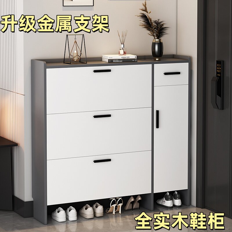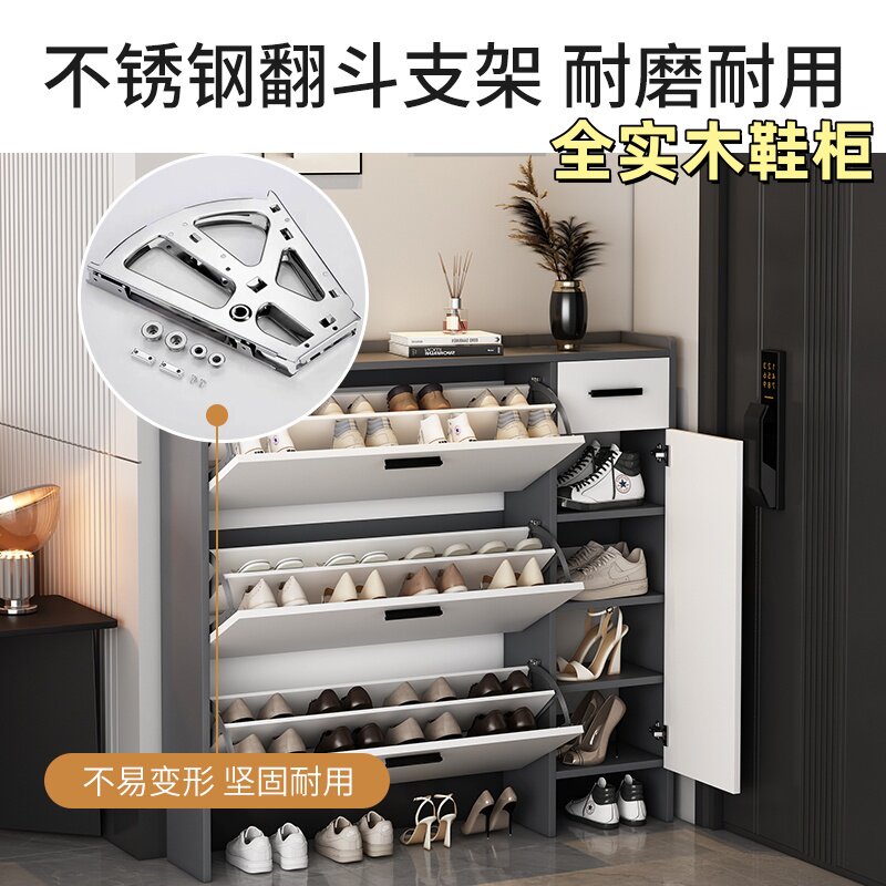靠墙收纳鞋 架 柜超薄翻斗大容量窄款 全实木金属门架纯生态板鞋