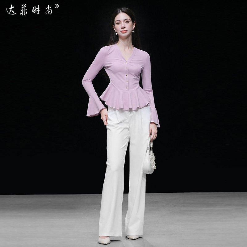 为您提供商品2026春装 法式 V领荷叶边收腰显瘦长袖 不规则坑条针织上衣 新款的详细介绍,