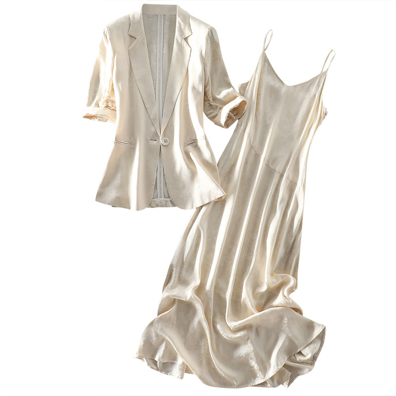 高档重磅真丝质感人丝人棉提花修身 西装 收腰吊带裙气质套装 中袖
