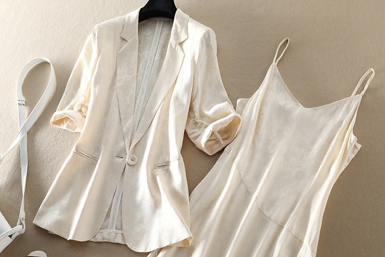 高档重磅真丝质感人丝人棉提花修身 西装 收腰吊带裙气质套装 中袖由