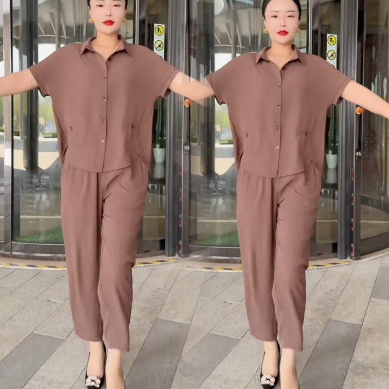 洋气减龄显瘦遮肉纯色短袖 2025夏季 新款 时尚 两件套休闲简约套装
