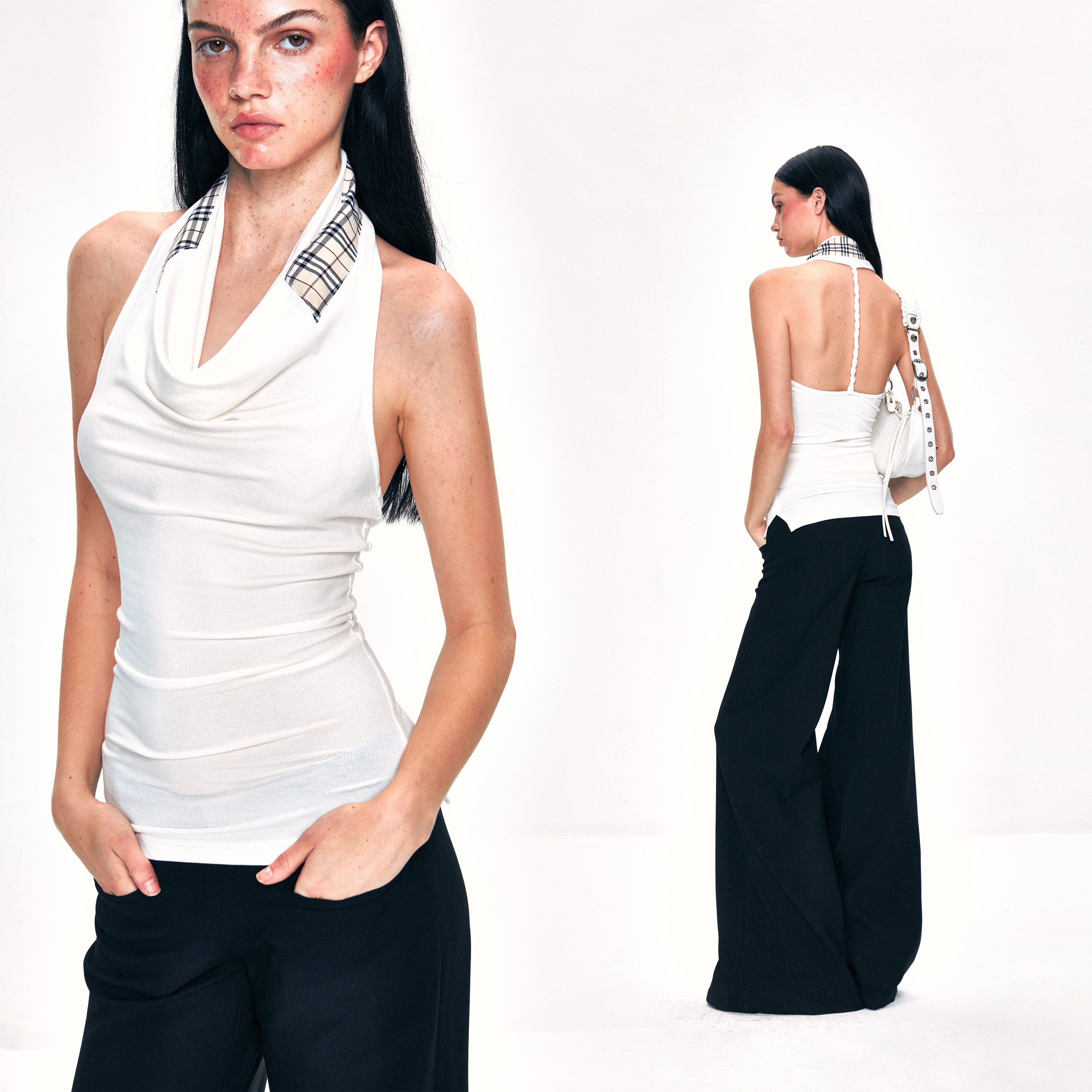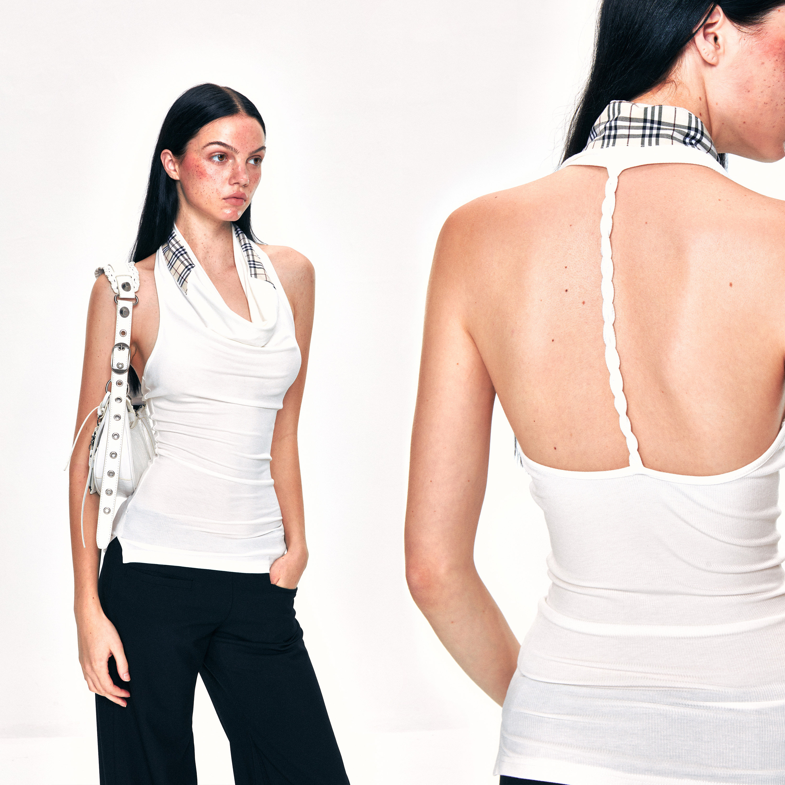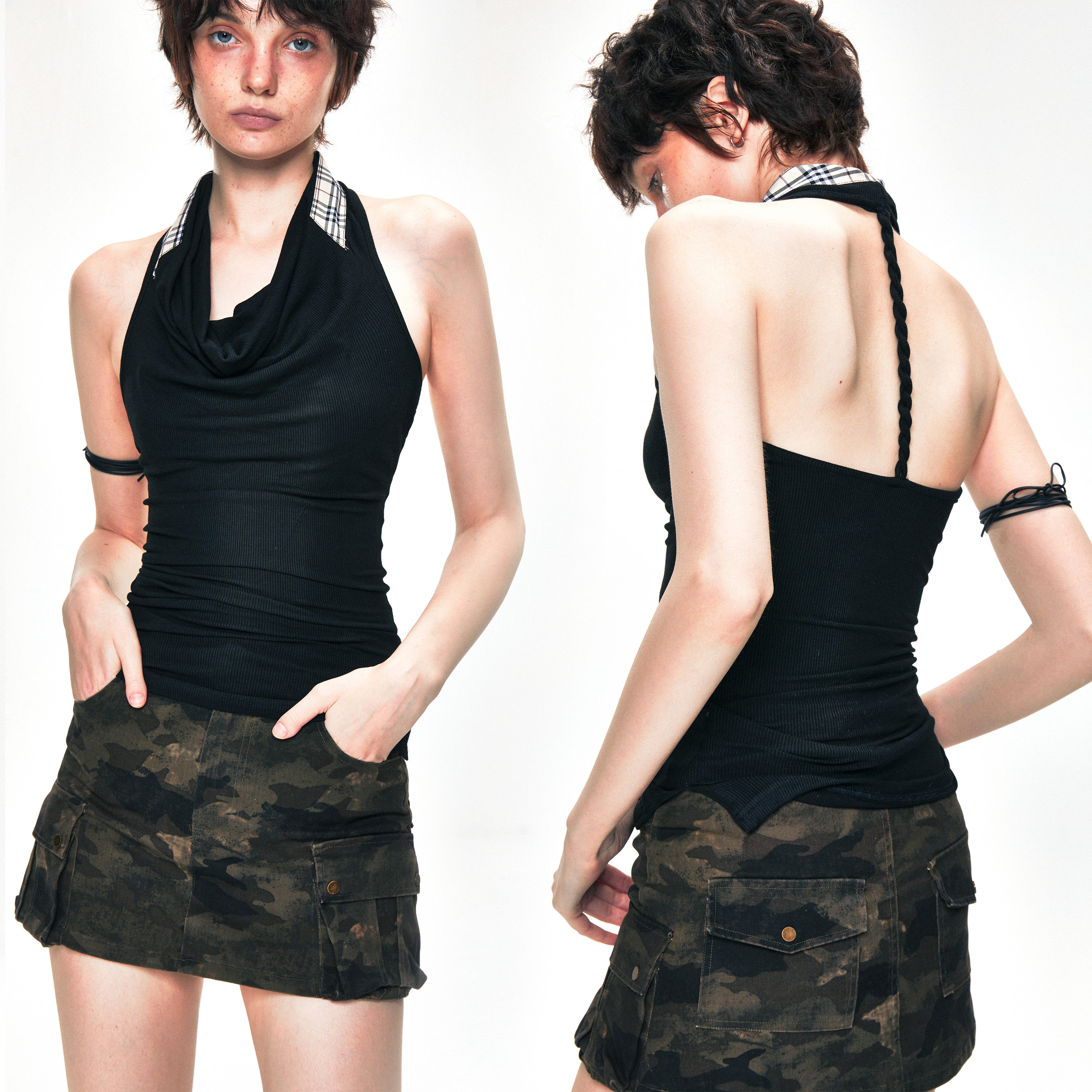 复古辣妹修身 KVKV 格纹荡领挂脖背心 美式 上衣 显瘦美背高级感无袖