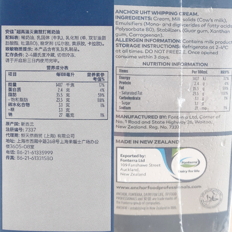 安佳稀奶油超高温灭菌搅打稀奶油烘焙原料蛋糕蛋挞奶盖
