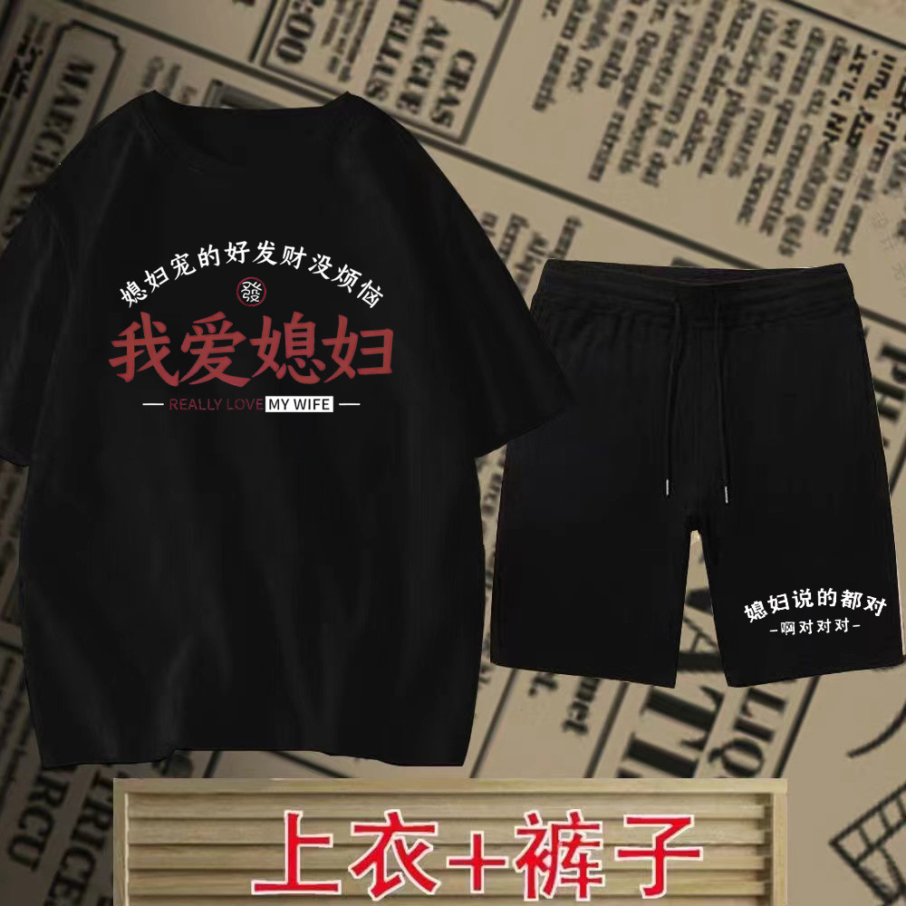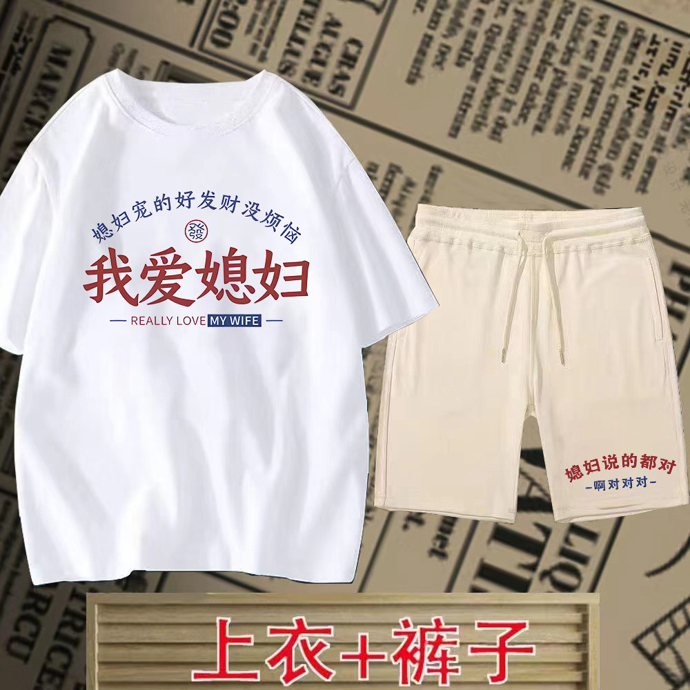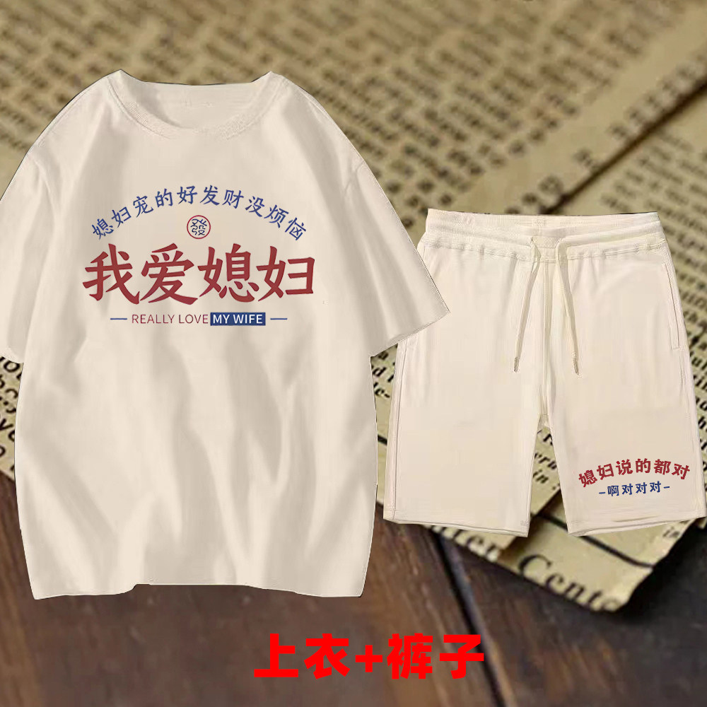 短裤 夏季 爆款 国潮我爱媳妇我爱老婆短袖 复古情侣上衣t恤百搭 套装由