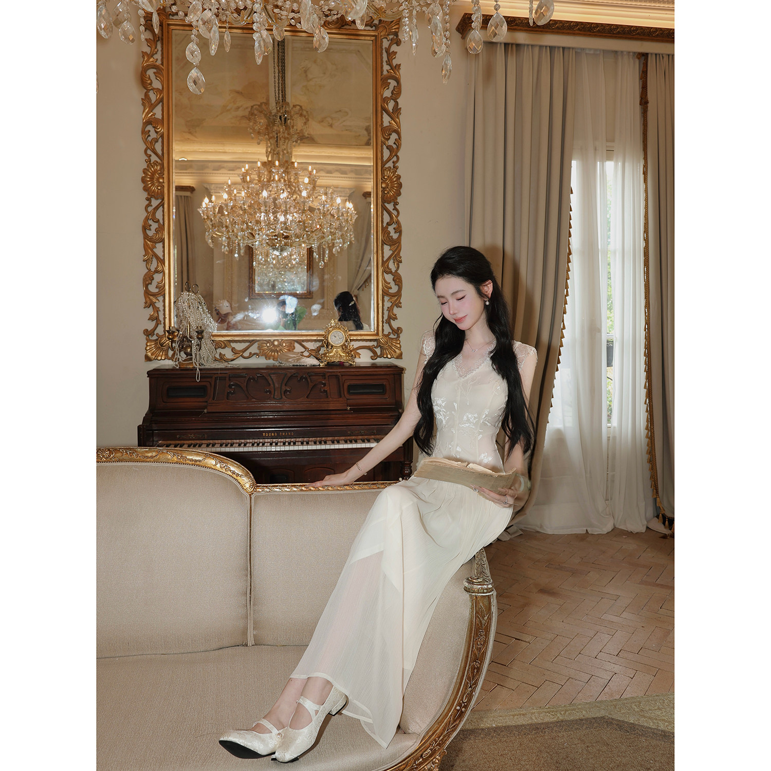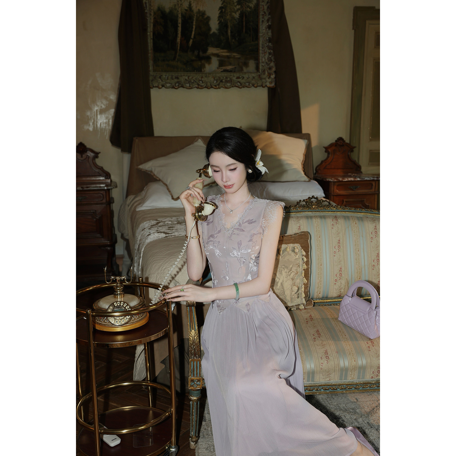 Sun雅乔 韩系气质修身 蕾丝拼接刺绣V领无袖 连衣长裙 月影幻纱