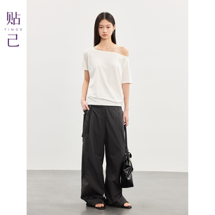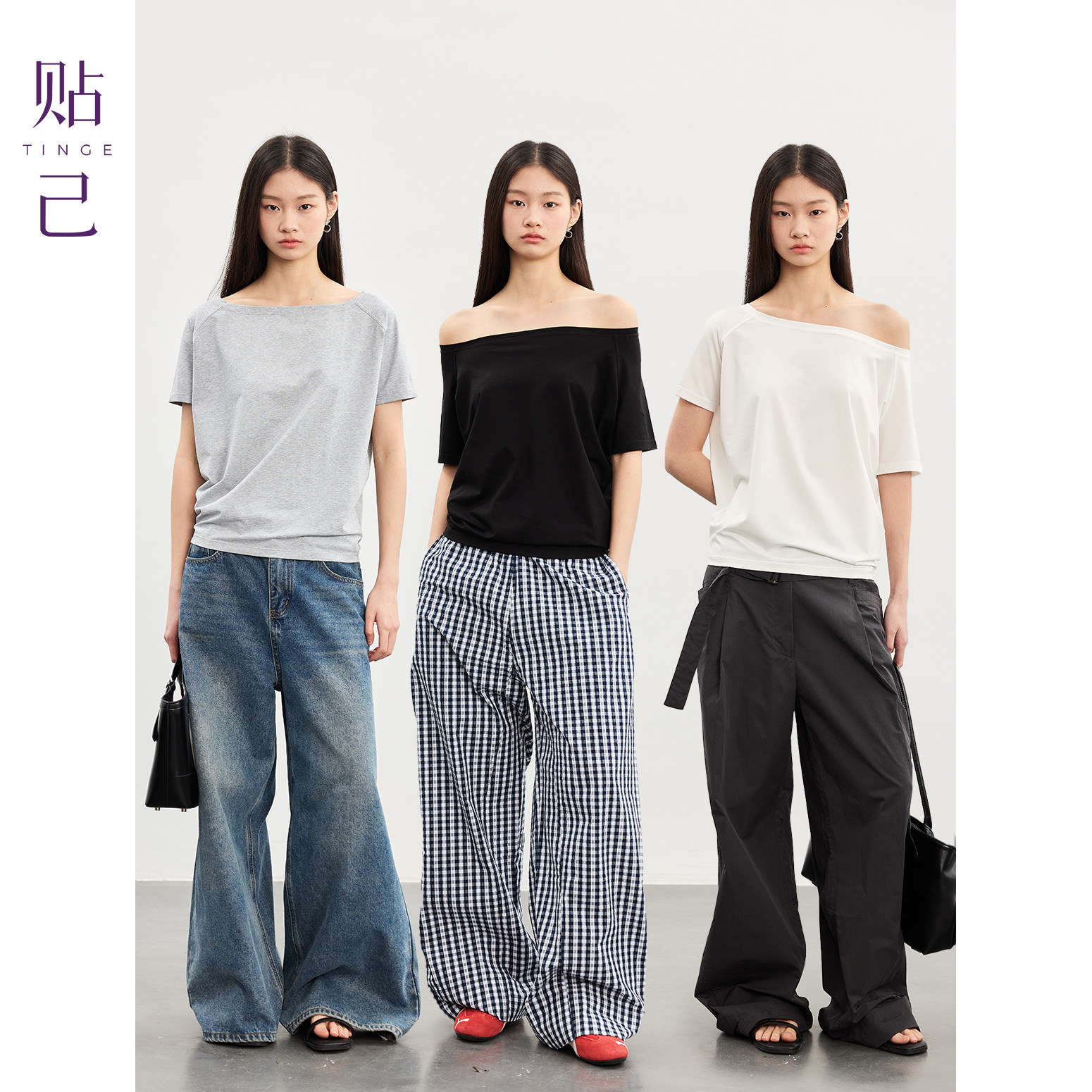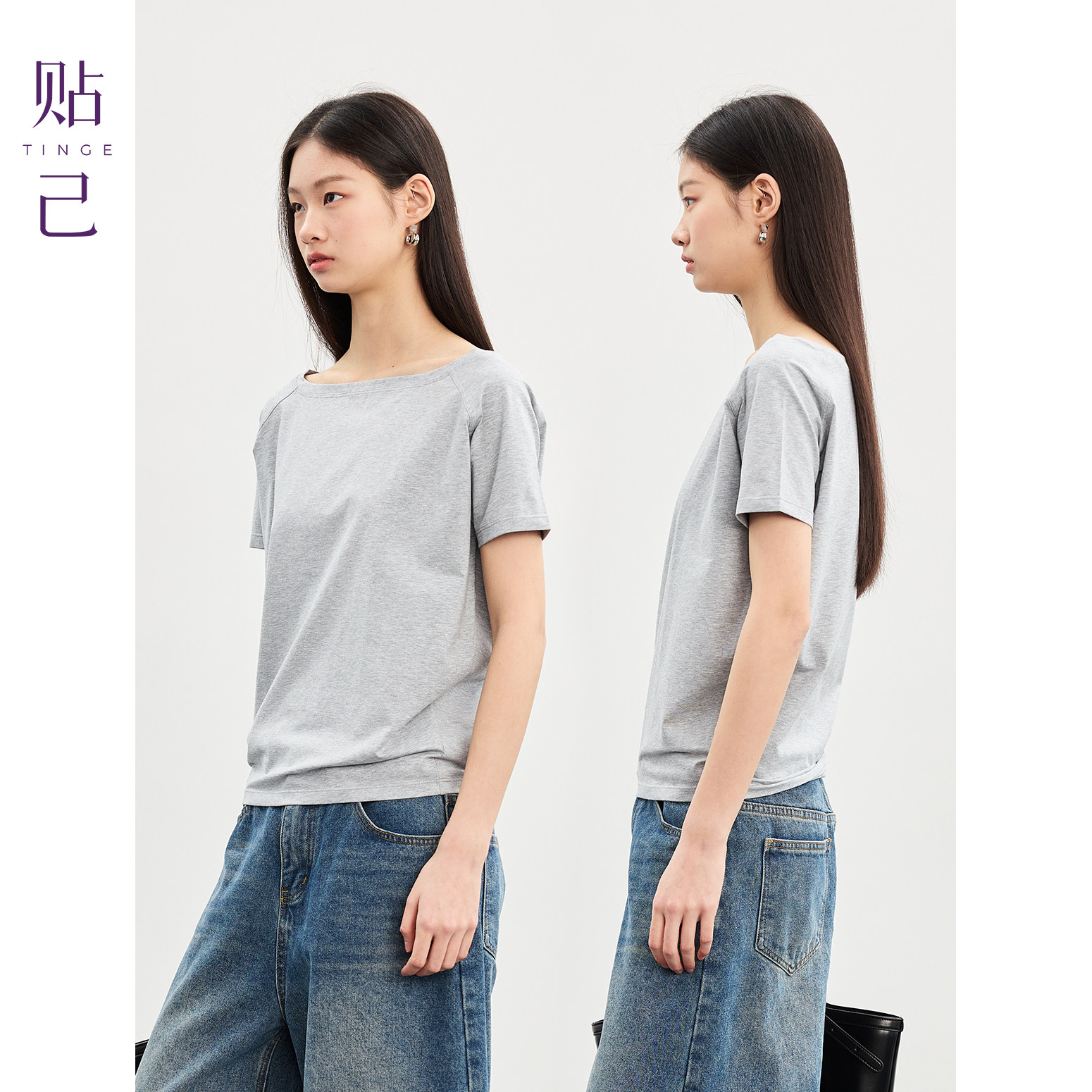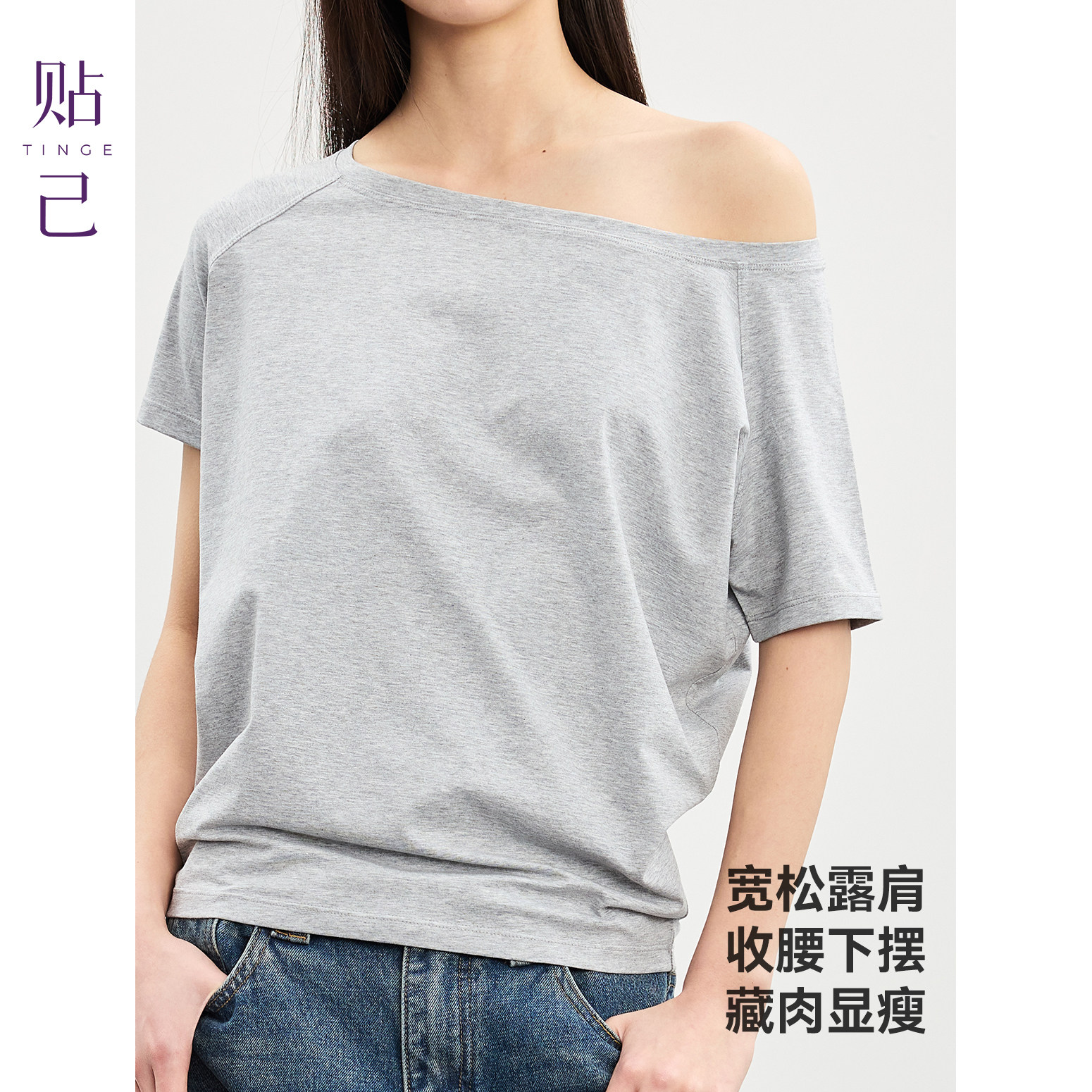 25年新款 上衣 T恤女夏季 TINGE贴己小众慵懒感斜肩一字领短袖