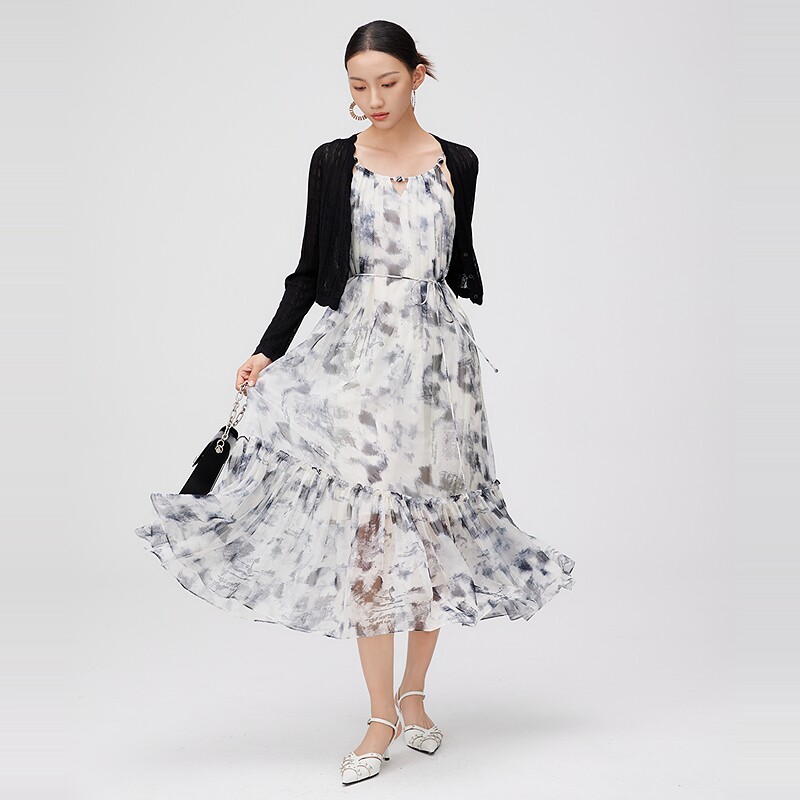 绣花拼接雪纺压褶宽松针织早春漂亮连衣裙 MOVEUP幻走2026春夏新品