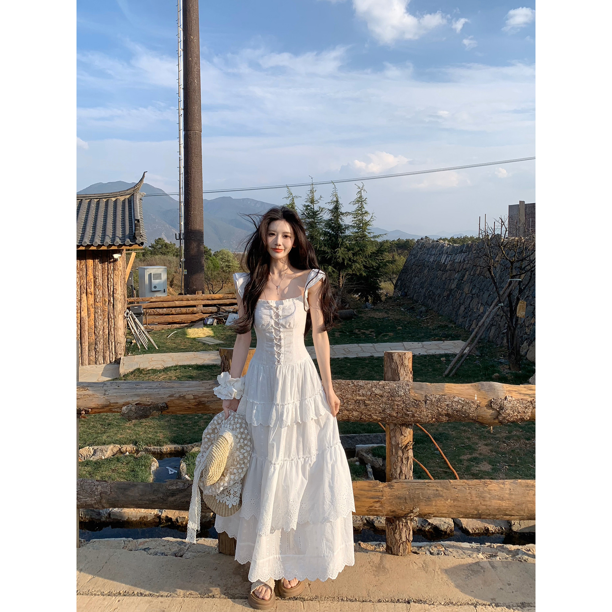RUISHI芮时 花朵系带宽松度假风荷叶边连衣裙子女夏 云絮柔漾