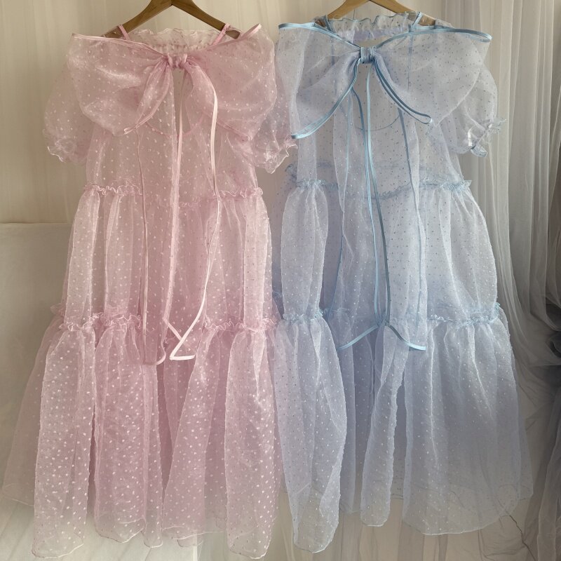 欧根纱连衣裙泡泡袖 夸张蝴蝶结日系叠穿罩裙外搭罩衫 原创设计师款