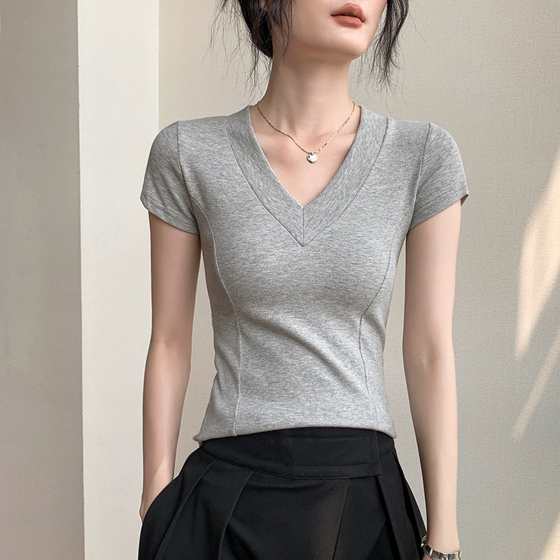 歌倍尚V领鱼骨短袖 显瘦外穿纯色百搭正肩上衣 T恤女夏内搭简约修身