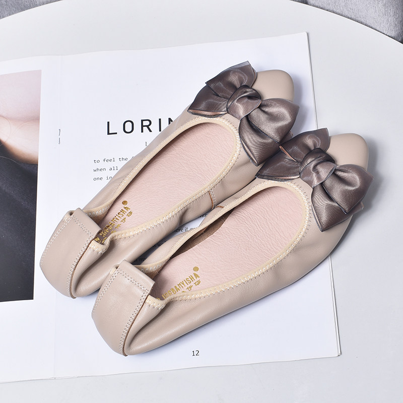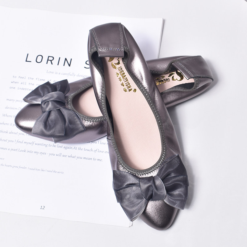 大码 25年尖头蝴蝶结真皮单鞋 软底蛋卷鞋 舒适平底孕妇鞋 女牛皮 瓢鞋
