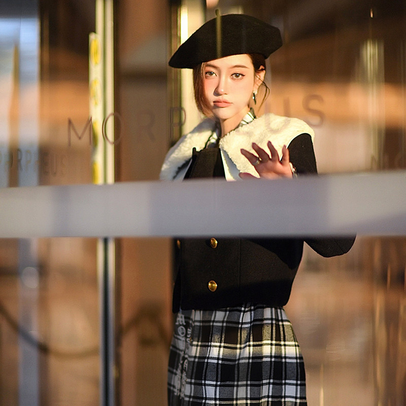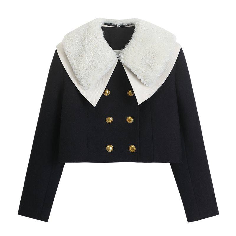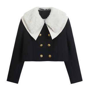 CAN2022秋冬新款 羊毛呢外套配羊羔毛领女 l娃娃领小个子短款