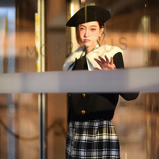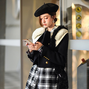 CAN2022秋冬新款 羊毛呢外套配羊羔毛领女 l娃娃领小个子短款由