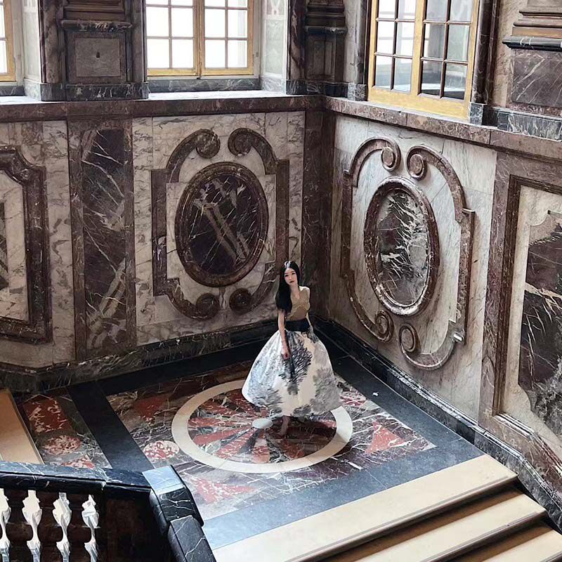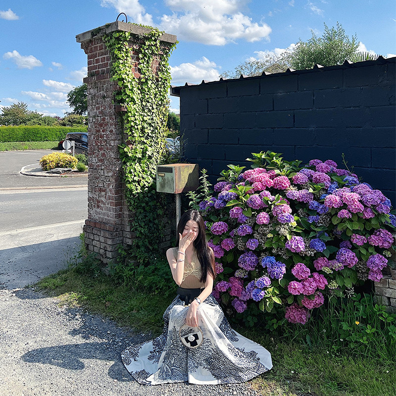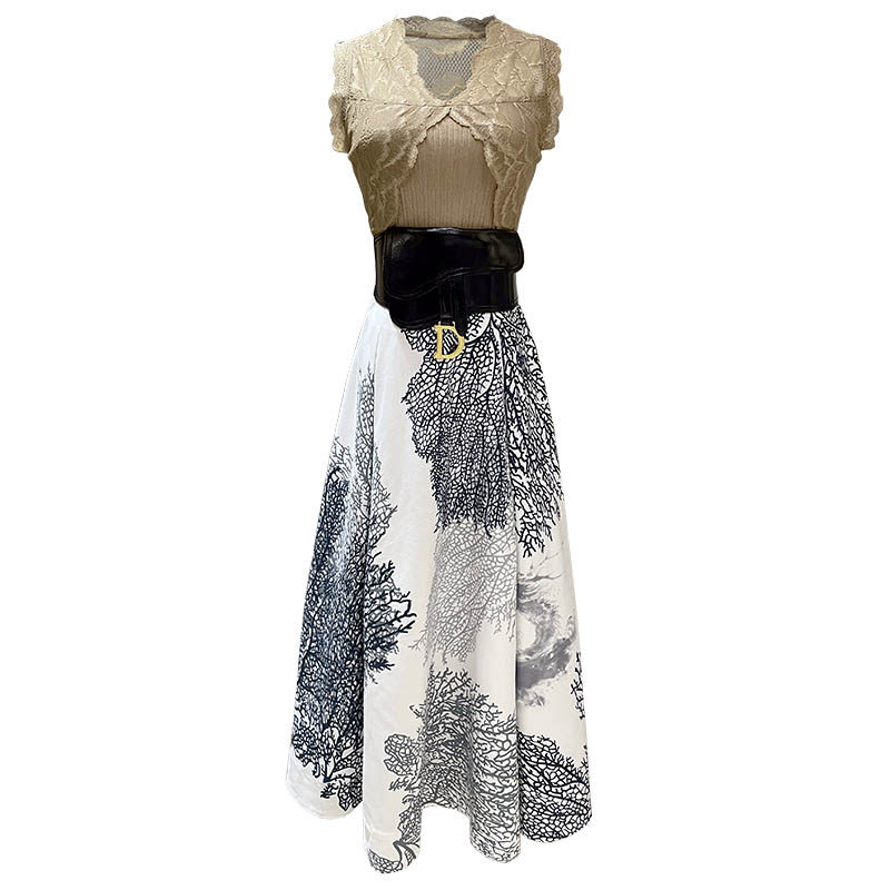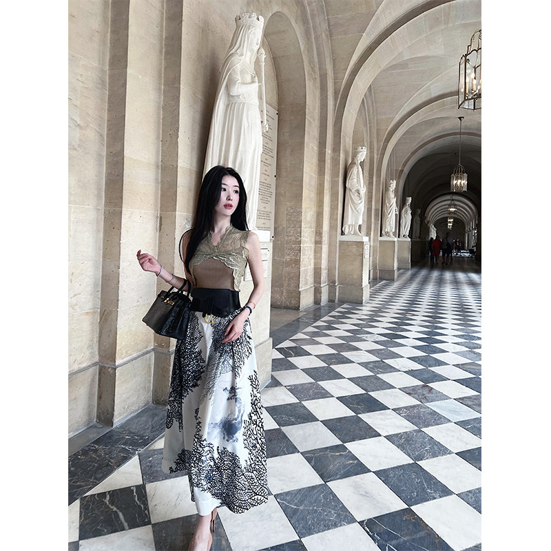 大女主曲珠纱蕾丝上衣一片式 定位印花半裙腰带套装 养尊处优由