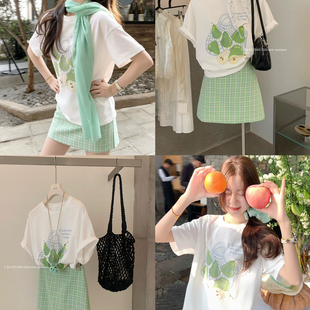 T恤 案印花短袖 伊嘉 9999 两件套 YS6 高腰格子a字半裙套装 Y.JIA