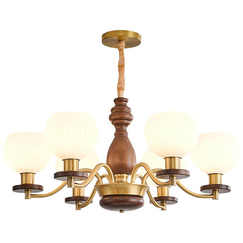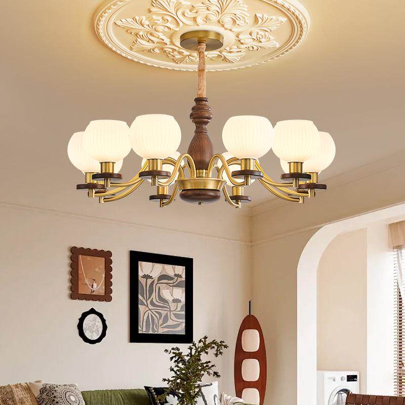 全铜美式 复古客厅吊灯新中式 北美胡桃木色2025新款 卧室灯 中古法式