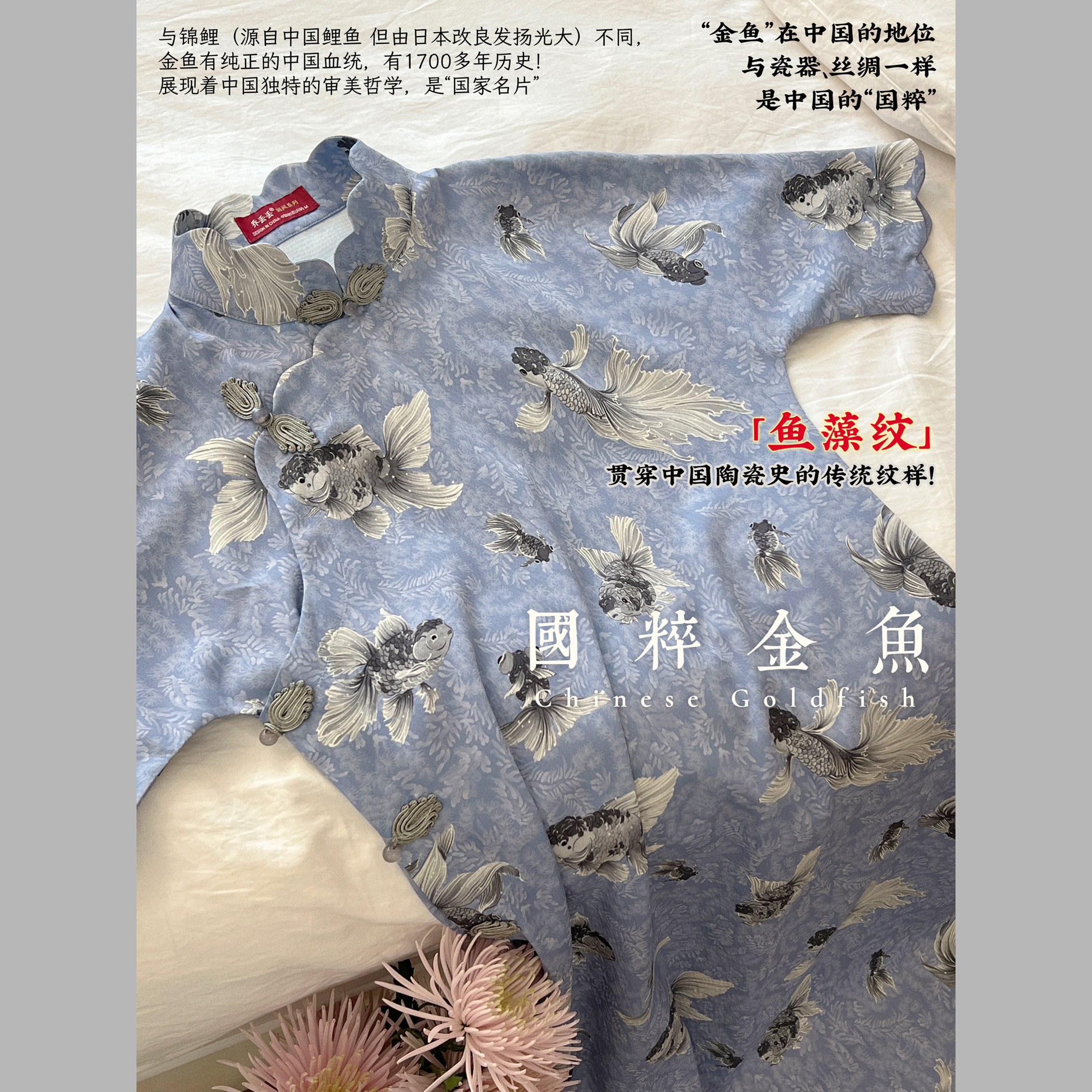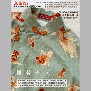 为您提供商品浪漫 池鱼戏春 中式 全开襟破肩花瓣领旗袍 原创手绘国粹金鱼的详细介绍,