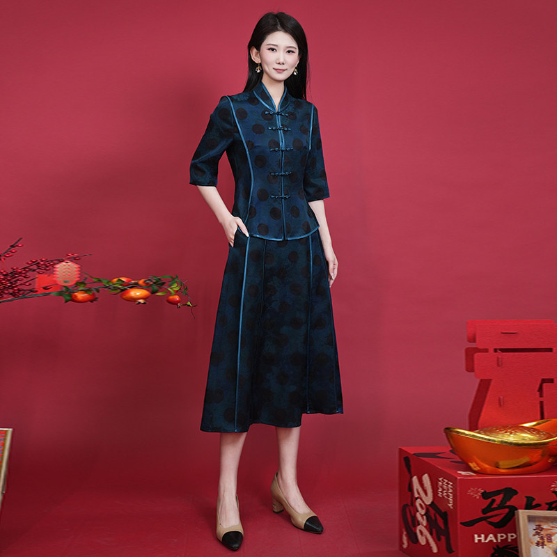 为您提供商品国风套装 浒城古娘新款 桑蚕丝印花立领盘扣复古短袖 新中式 女夏季的详细介绍,