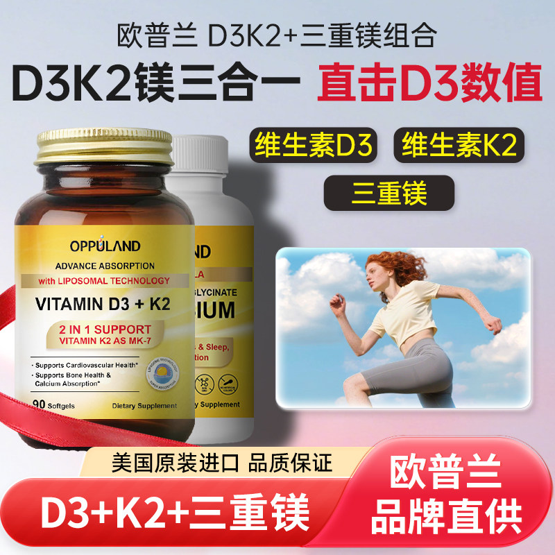 进口Oppuland脂质体维生素D3K2镁三合一甘氨酸镁补充剂成人d3补钙