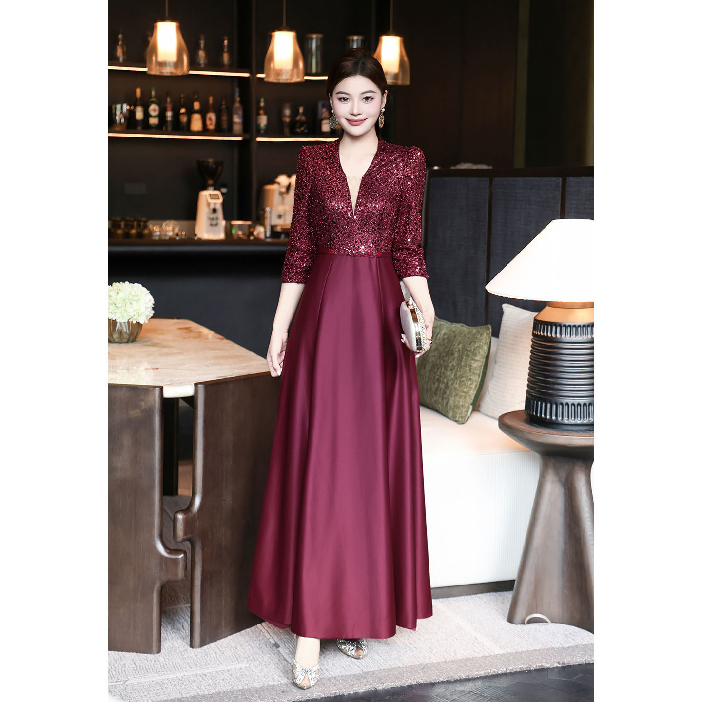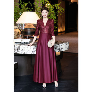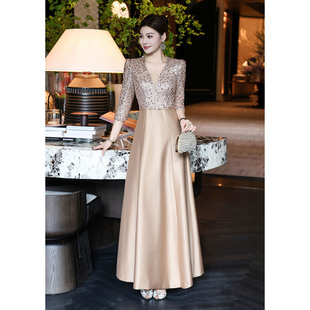 闪闪订钻宴会连衣裙 高贵气质优雅V领亮片喜妈妈礼服长裙华丽修身