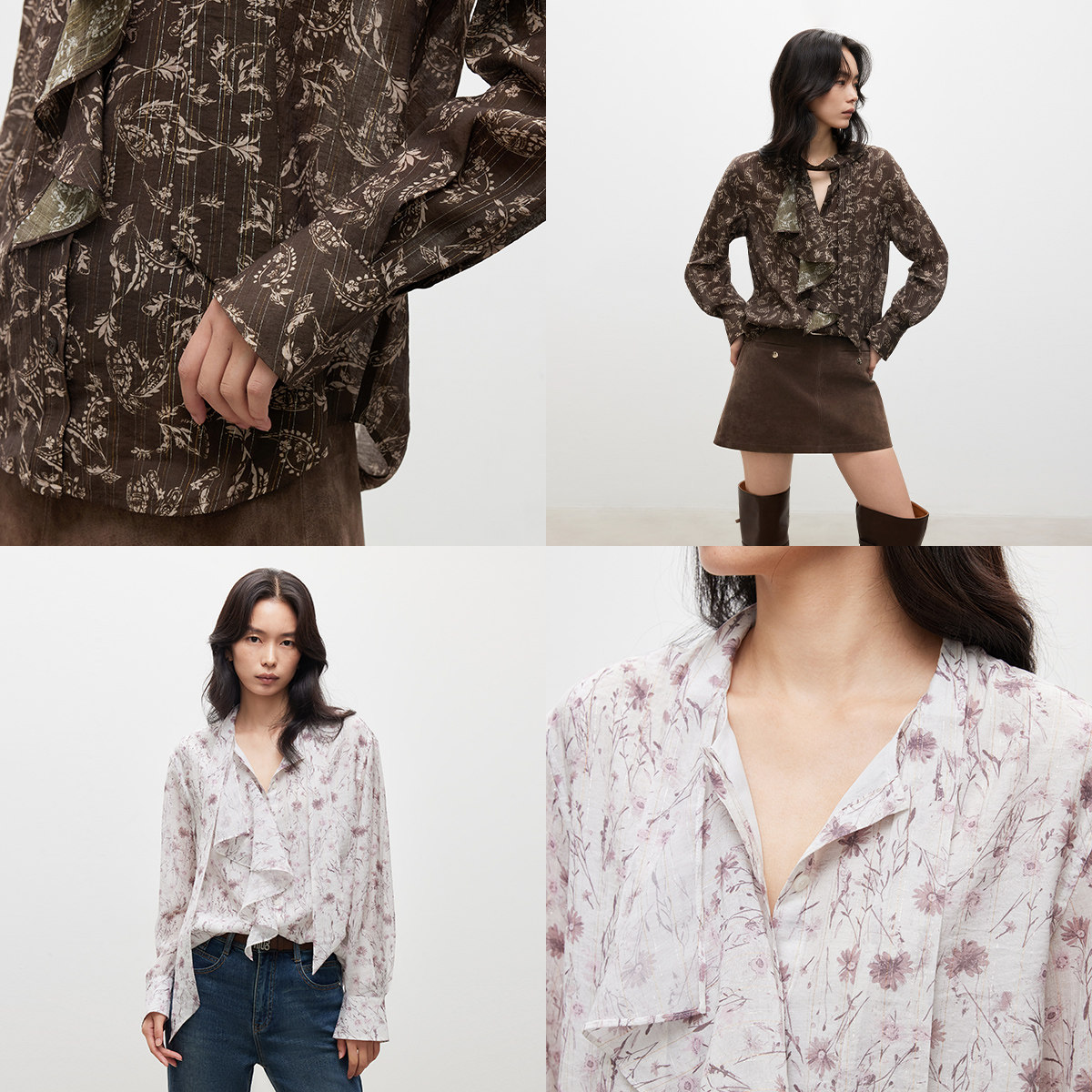 ONLY2026春季 法式 浪漫飘带印花荷叶边系带领口花边衬衫 上衣女 新款