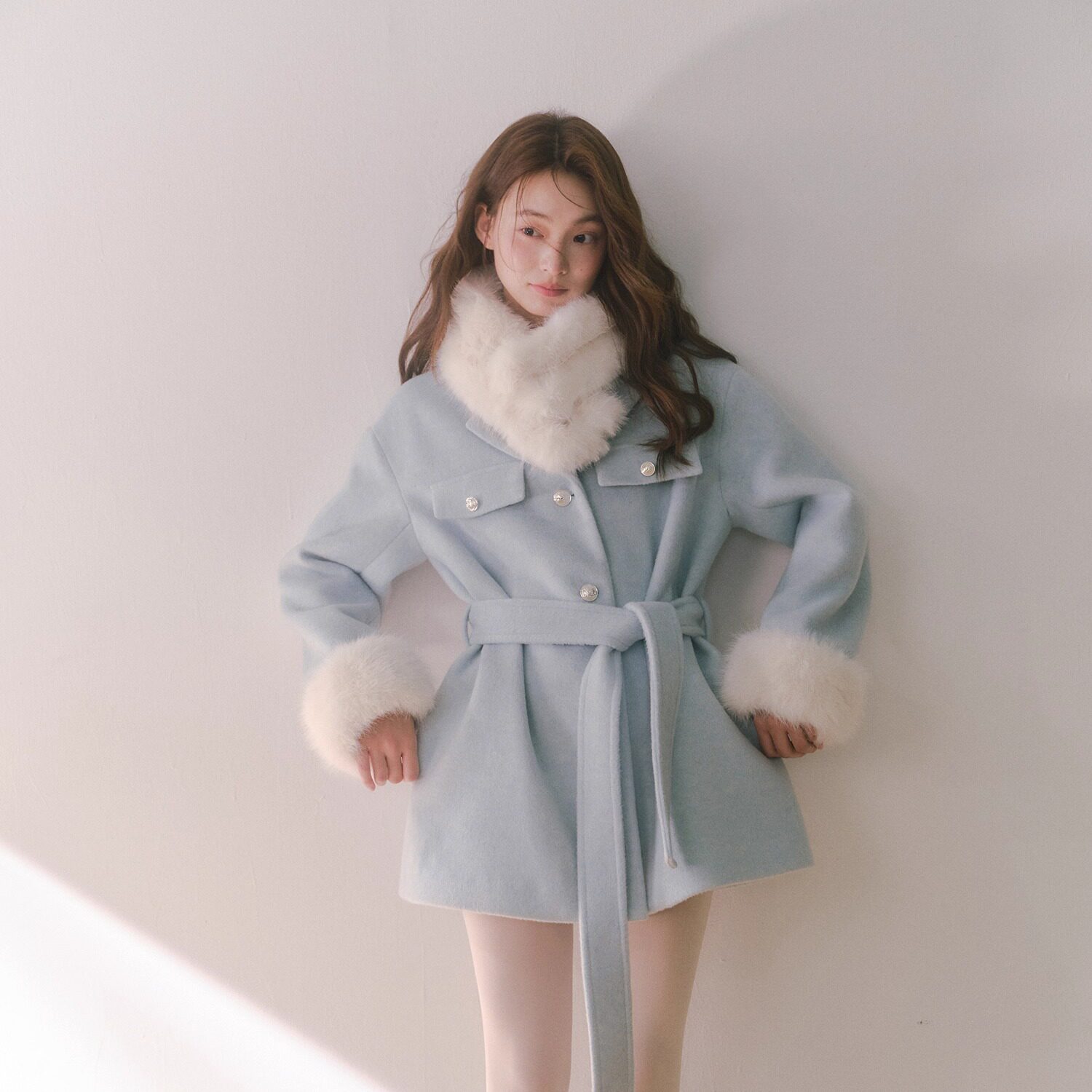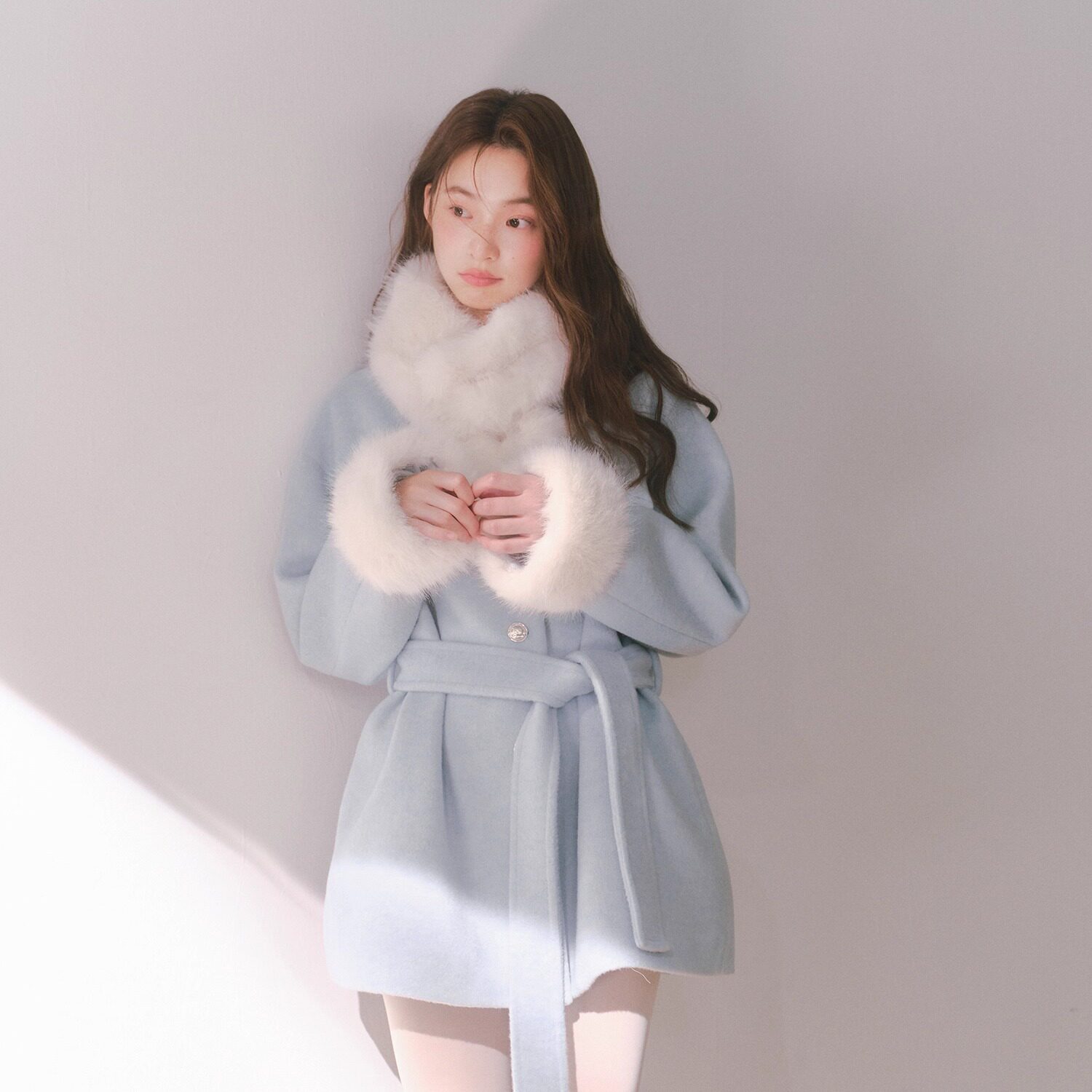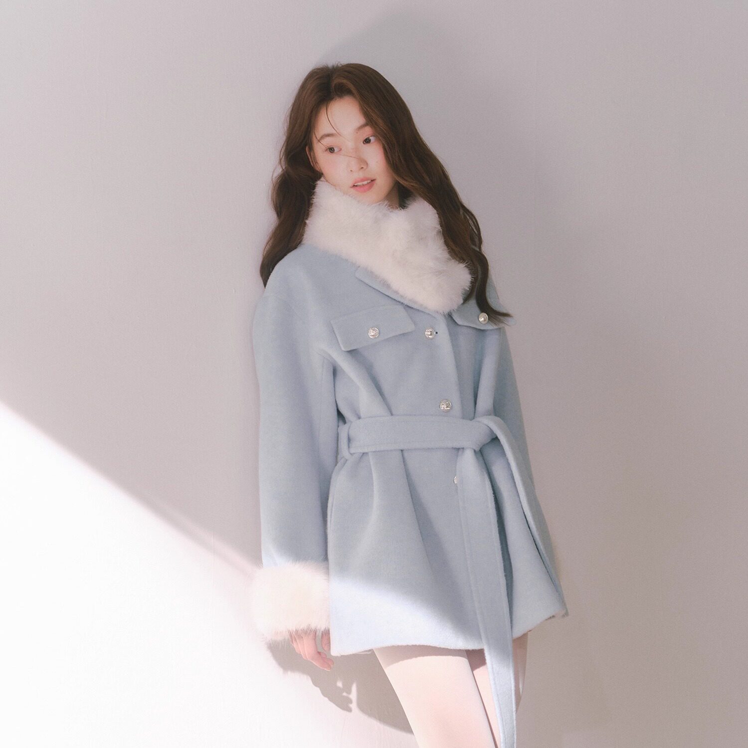 为您提供商品RECIT 毛呢外套 冰岛蓝可拆卸毛领含羊毛大衣女秋冬收腰系带中长款的详细介绍,