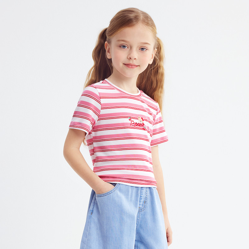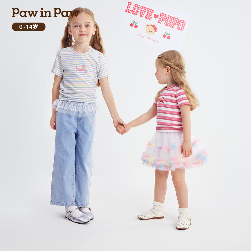 PawinPaw卡通小熊童装 新款 女童女宝宝正肩袖 条纹T恤 26年春夏季由