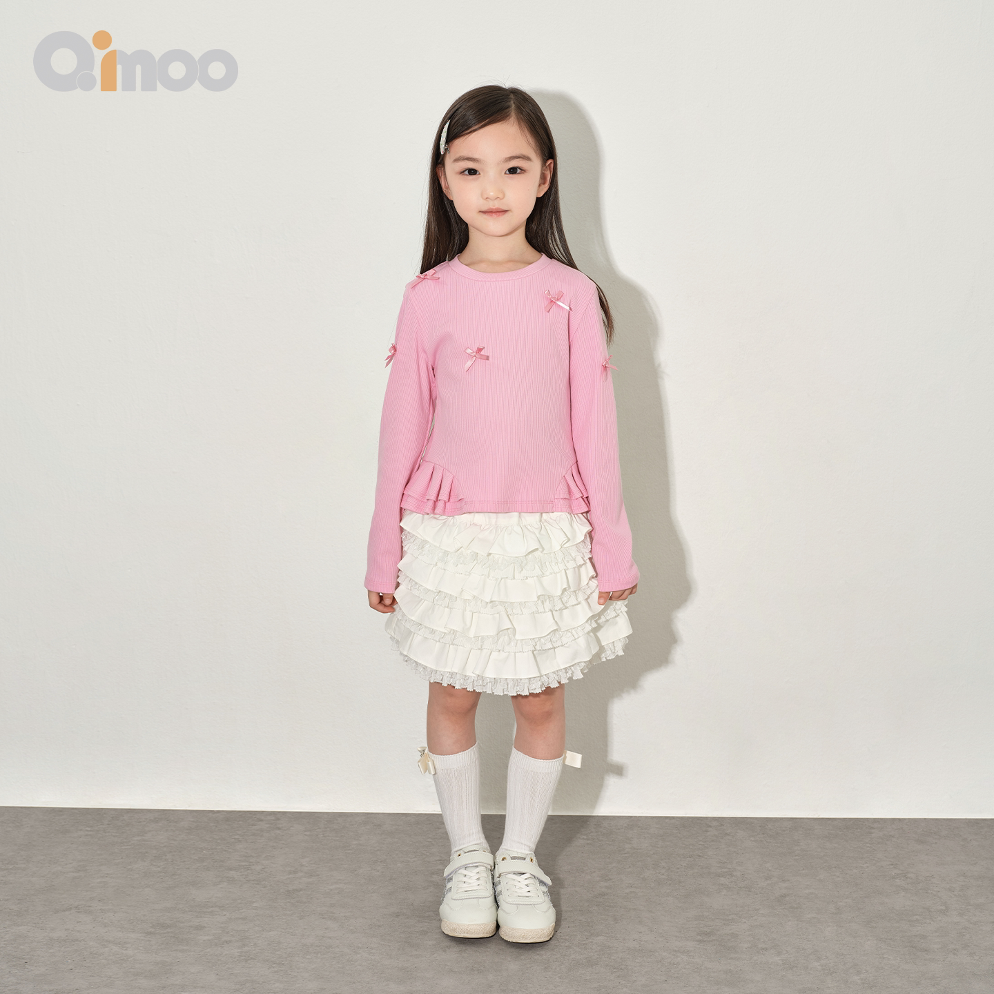 Qinoo淇木26春季 童装 女童蝴蝶结长袖 T恤甜美少女感圆领上衣 新款