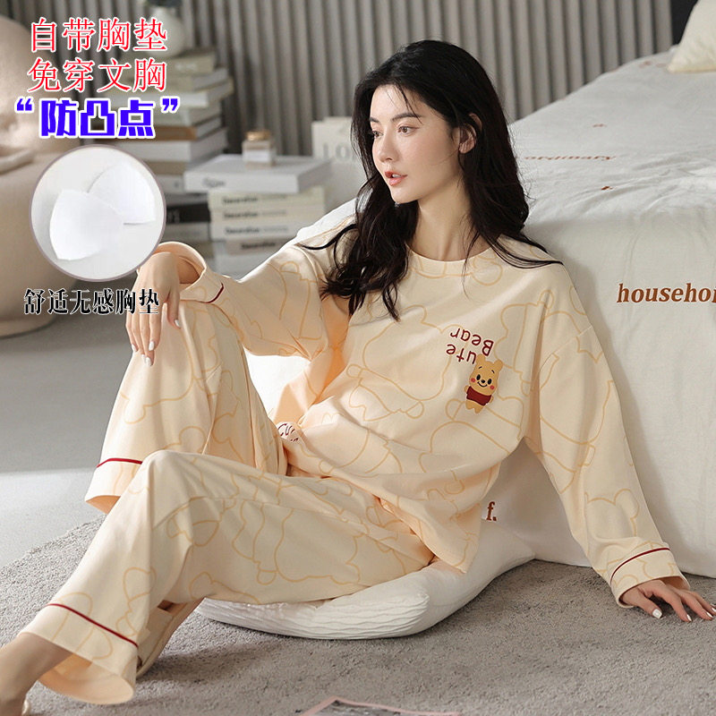 夏季 睡衣女款 春秋2026新款 纯棉长袖 带胸垫全棉布料女士家居服套装