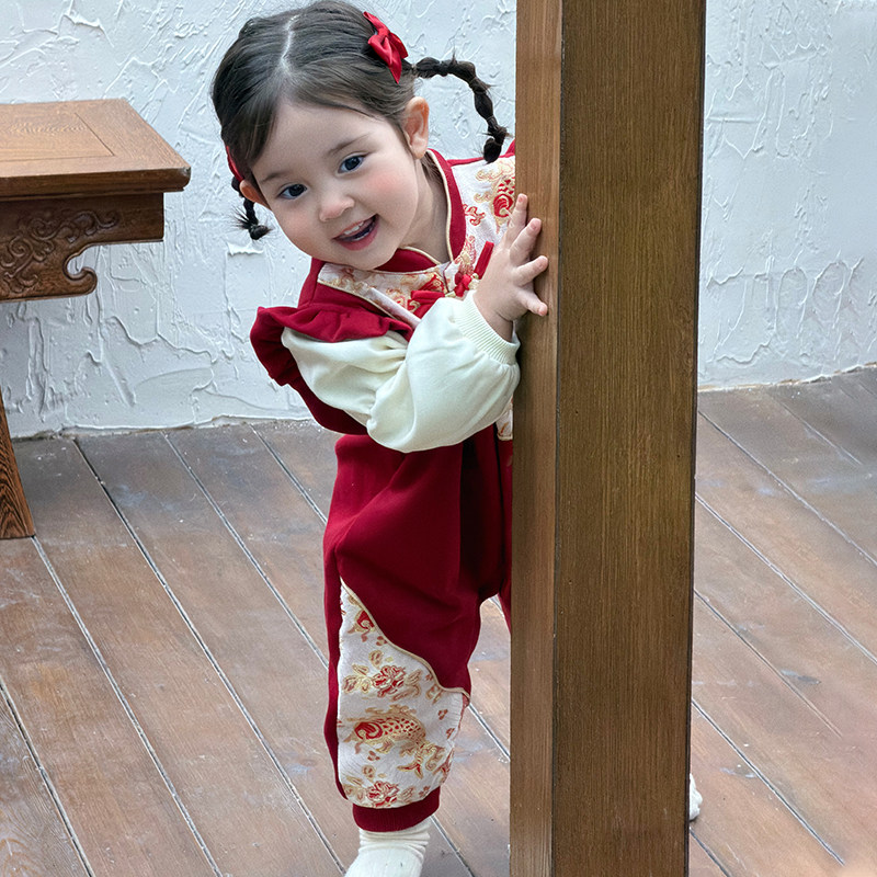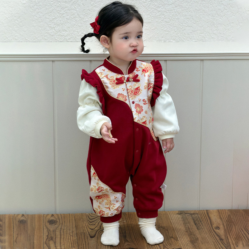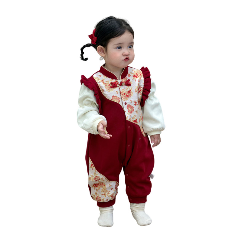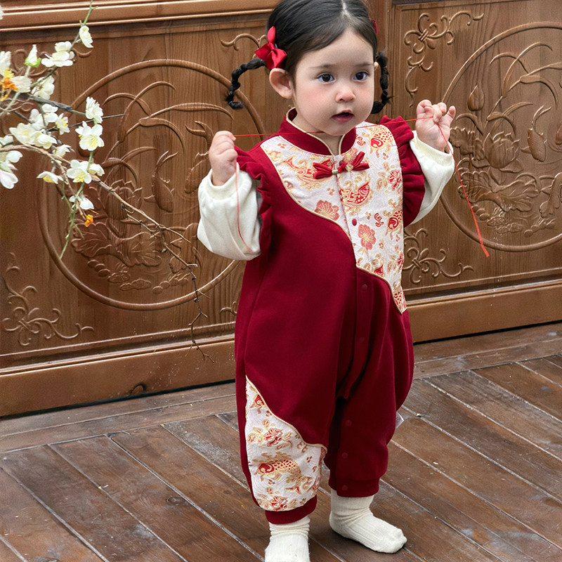 婴儿过年衣服新中式 女宝宝满月百天周岁宴礼服拜年服 连体衣春秋季