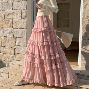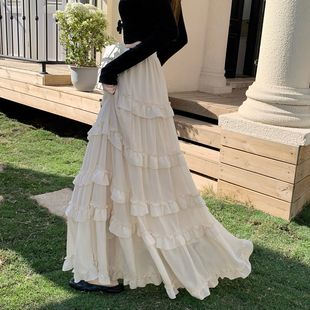 高腰显瘦Aa字裙大摆长裙子 白色荷叶边雪纺蛋糕裙半身裙女2026春季